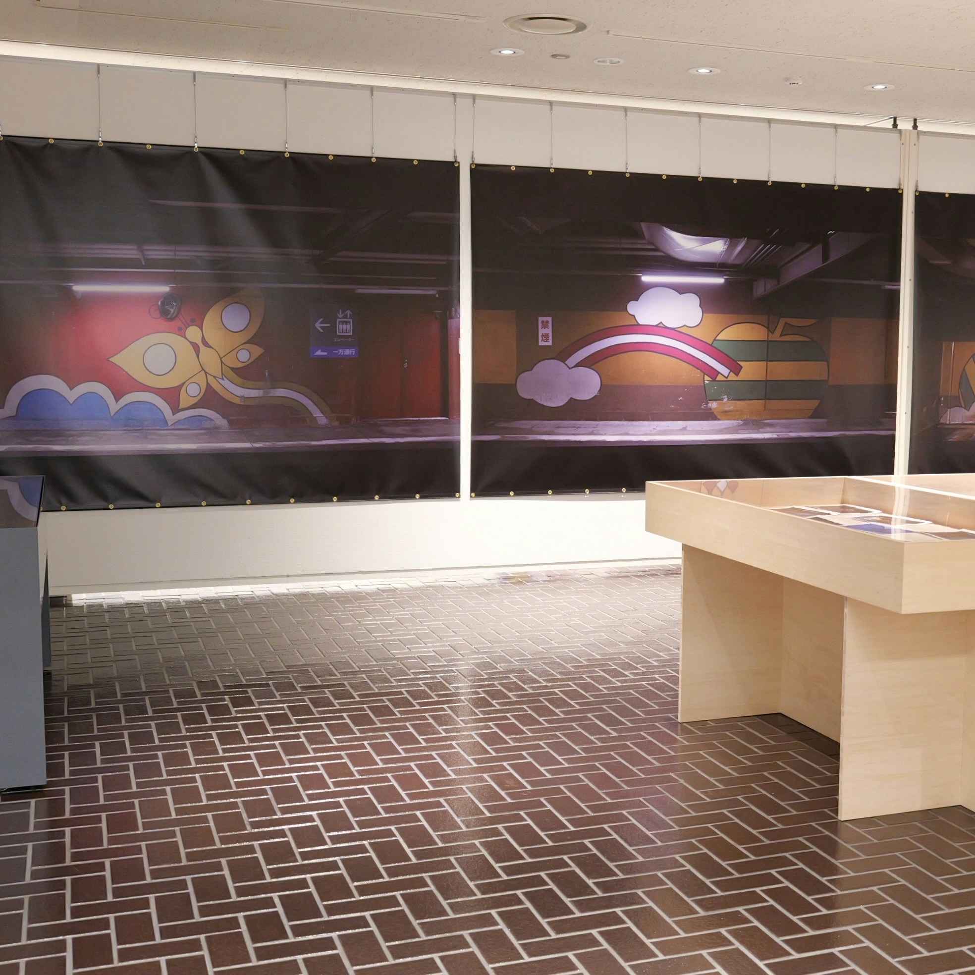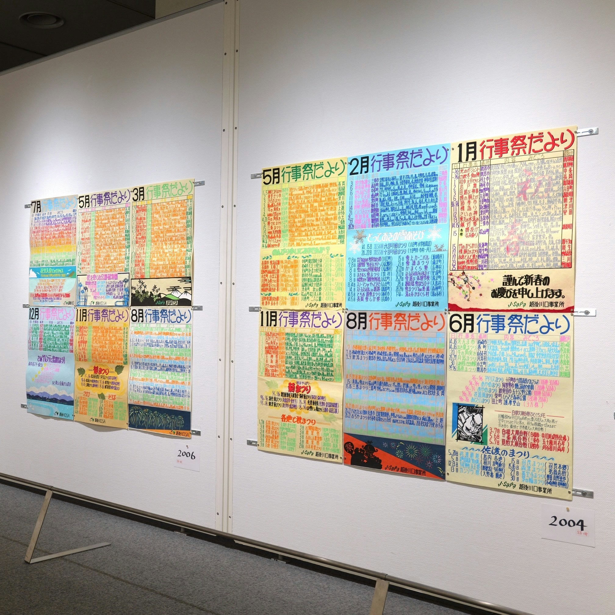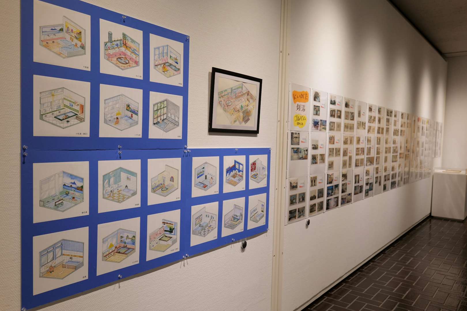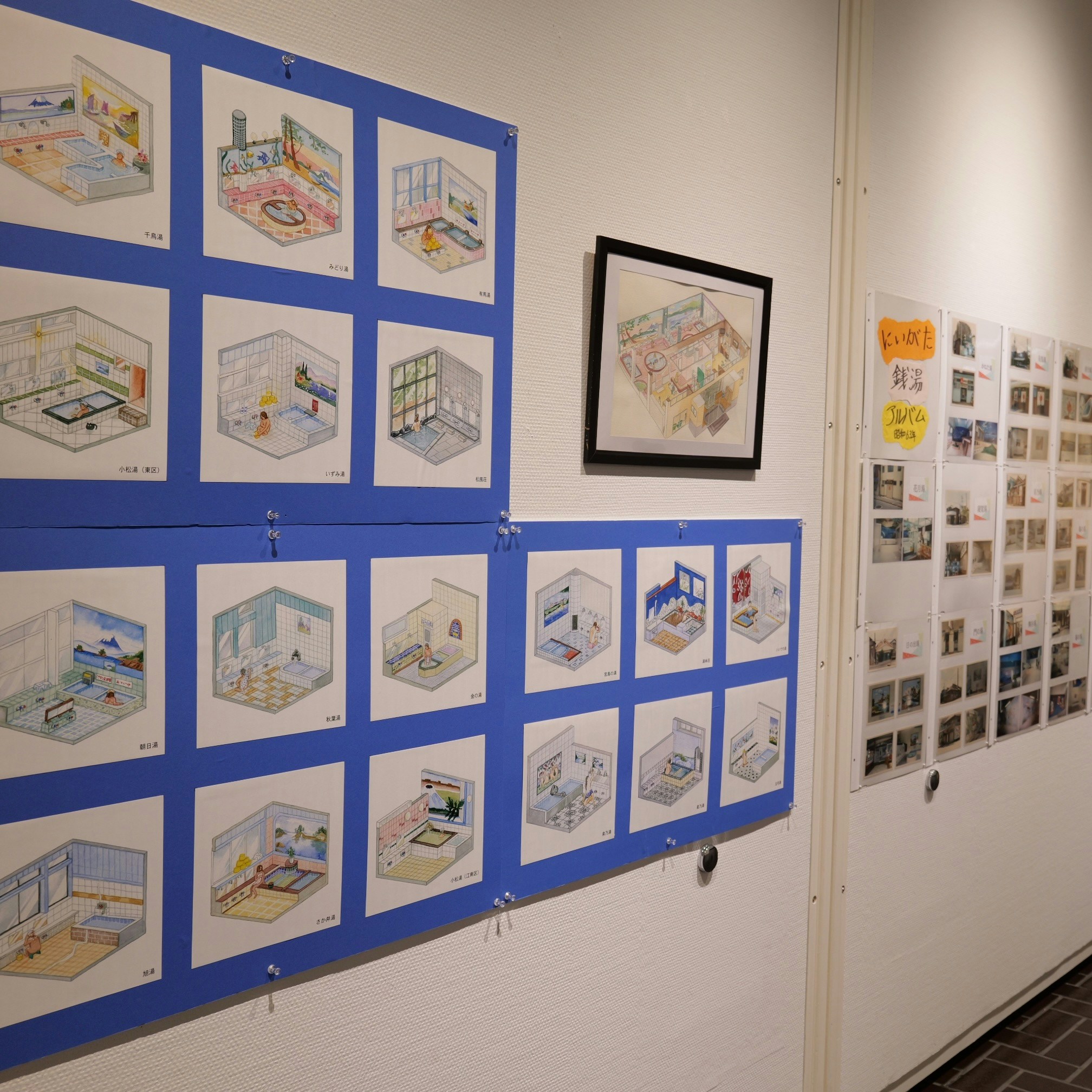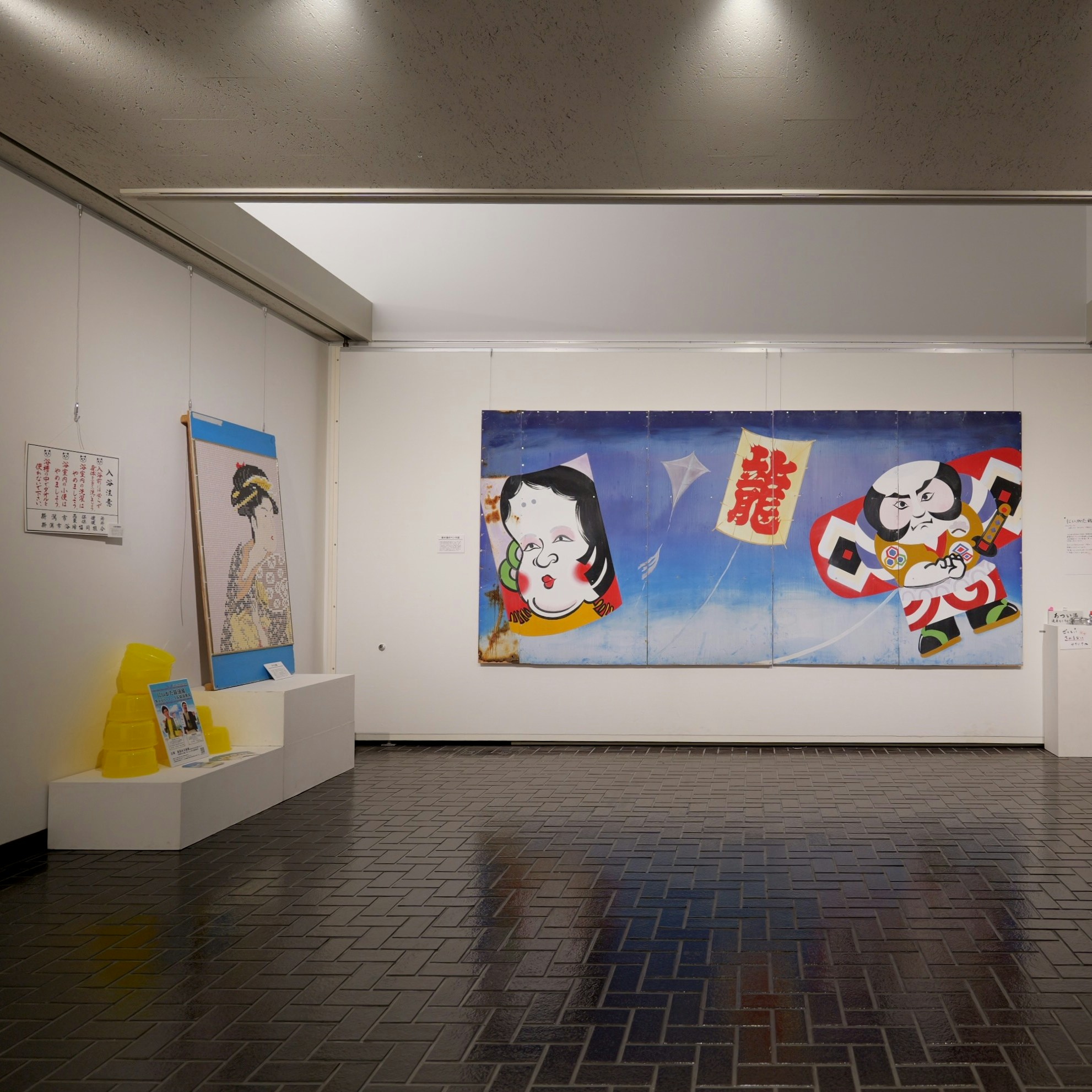 展覧会はまず「にいがた銭湯展」から始まる。本展は「にいがた銭湯大使」に任命されている、お笑いコンビ・ジャックポットの大野まさやと春巻まさしがゲストキューレーターを務めた。新潟市の各所にある様々な銭湯を、時代の変遷とともにきえていったものも含めて写真やイラストで紹介するほか、銭湯の装飾に使われる表現についても注目。上古町にある「菊の湯」で浴室に飾られており、休業時に新潟市歴史博物館へ寄贈されたペンキ絵は、描き変える必要がないタイル絵に取って代わられて、いまや全国的にも希少な存在だ。いっぽうのタイル絵も業者が少なくなってきており、その鮮やかなモザイクアートの技術も失われつつある。ほかにものれんや衣類カゴ、「ケロリン」の桶など、新潟の銭湯の歴史と、そこに宿った小さな美学が紹介されている。