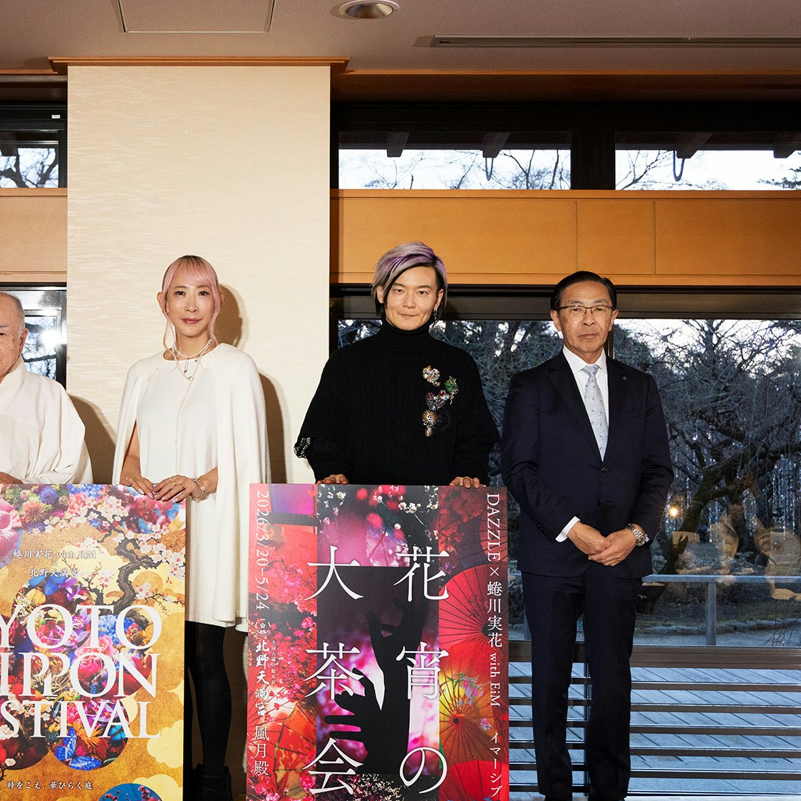 さらに3月20日からは、風月殿を舞台とするイマーシブ公演《花宵の大茶会》も実施予定。本作は、蜷川実花 with EiMとダンスカンパニー・DAZZLEによるコラボレーション作品であり、400年前に北野天満宮で開催されたとされる豊臣秀吉の茶会を着想源に、その「幻の二日目」を現代に立ち上げるものとなる。開催に先立ち、DAZZLE主宰の長谷川達也による「奉納の舞」も披露された。
