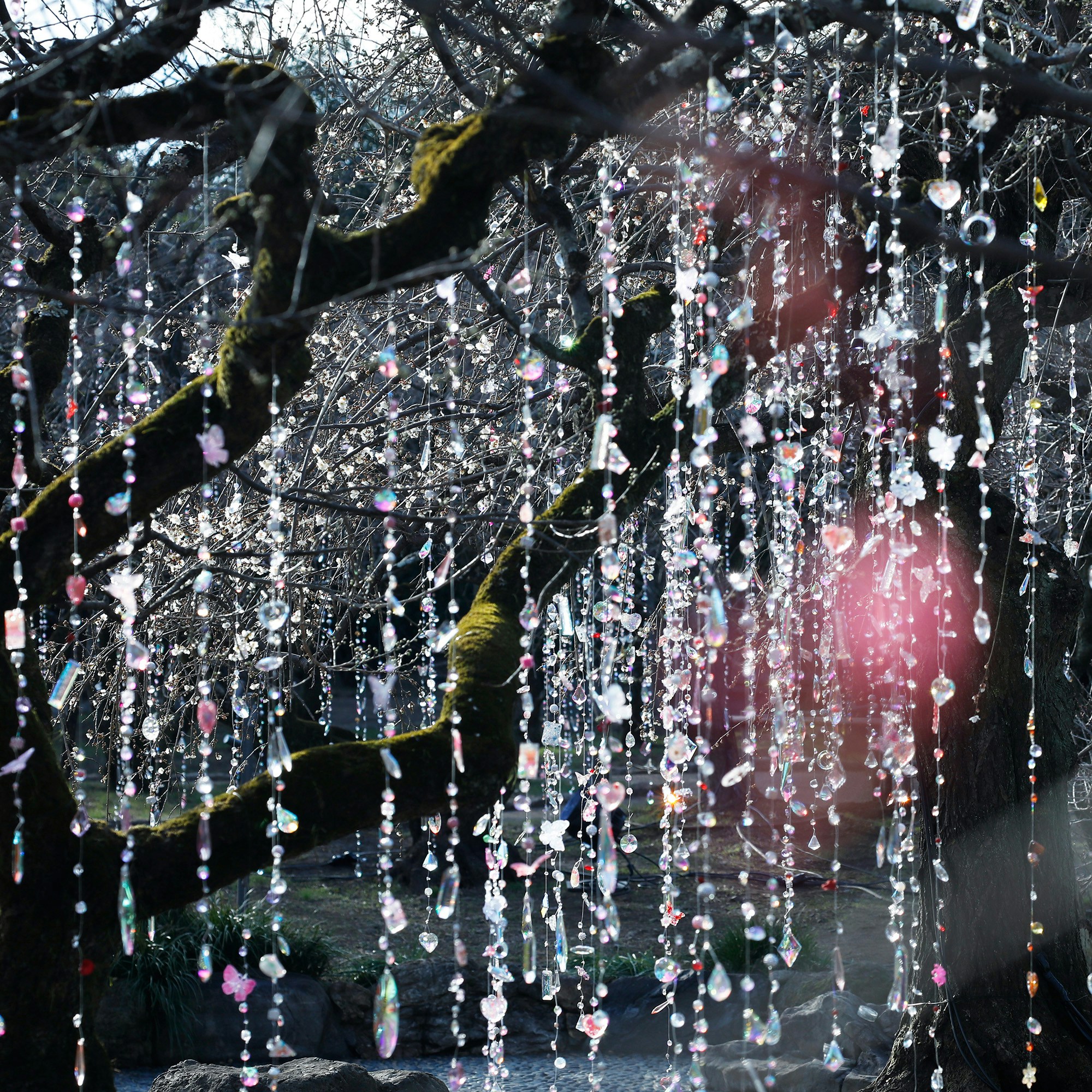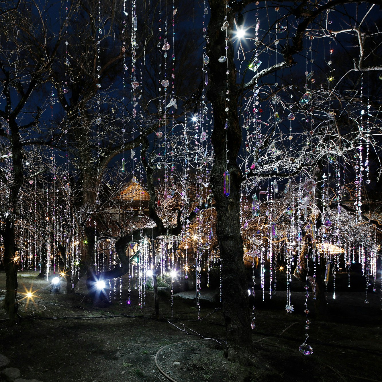 《光と花の庭》は、北野天満宮が祀る菅原道真が11歳のときに詠んだ漢詩「月夜見梅花」をコンセプトとしている。「輝く月は晴れた日の雪のよう」「咲き誇る梅は星のよう」と詠まれた情景が、そのまま立ち上がるかのような作品だ。梅苑の木々に吊るされた約1200本のクリスタルが、季節や時間帯によって表情を変え、目を向けるたびに異なる輝きを放つ。