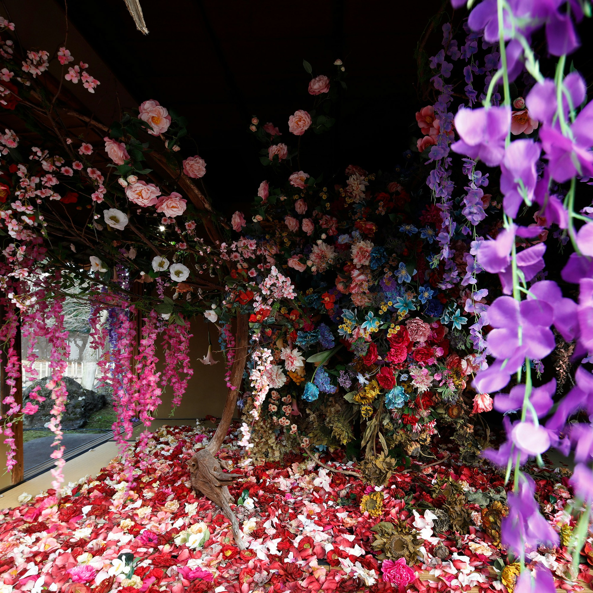 また、御土居 梅交軒に展示された《残照》は、蜷川がこれまでも手がけてきたシリーズの最新作だ。「場所の力も借りることができ、今回は最高傑作だと感じている」と蜷川は語る。咲き誇る花と枯れゆく花という対照的な状態が茶室空間に共存し、いのちの循環や時間の不可逆性を静かに示す構成となっている。