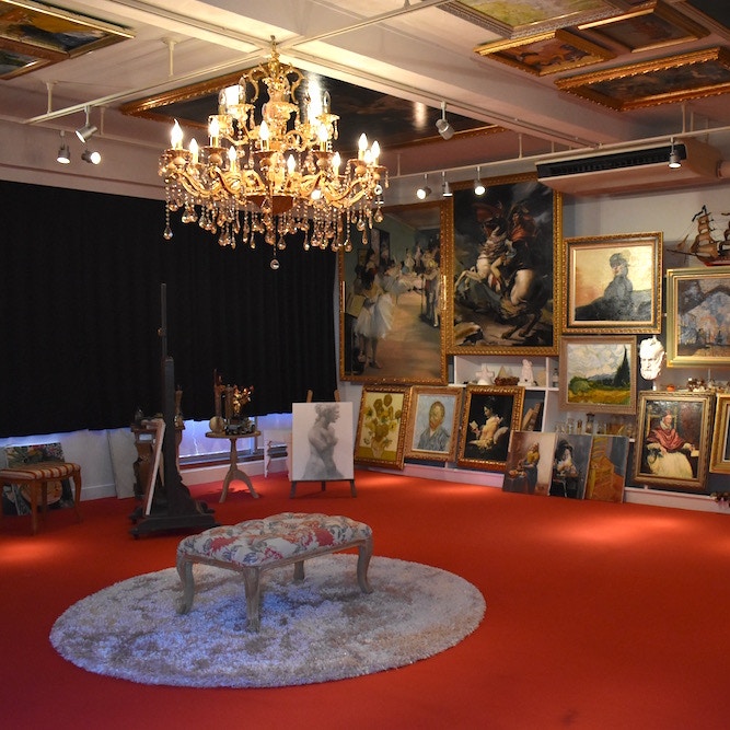 校舎の一角に突如現れる、数々の名画と赤い絨毯とシャンデリアで飾られた豪華絢爛な空間。その名も《美術室》と名づけられた空間に飾られている絵画は、作家の豊福亮が学校長を務める千葉美術予備校の生徒たちが模写したものだ。古典的な絵画の模写は、昨今の受験絵画の傾向とは異質なものだが、想像力や技術を鍛えるための美術教育の一環として位置付ける作家の思いが込められている。