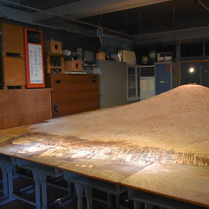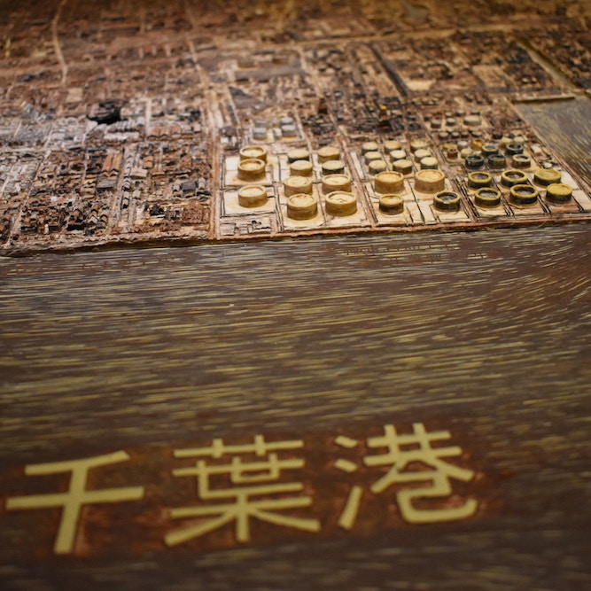 小学校には必ずある机。それを作品に変えたのが角文平だ。《養老山水図》と名づけられたインスタレーションでは、学校机を彫ることで、市原の地図を机上に立体的に出現させた。木屑は山のように積み上げられ、頂上には会場であるIAAESがポツンと佇む。都市と里山の対比が象徴的に表されている。