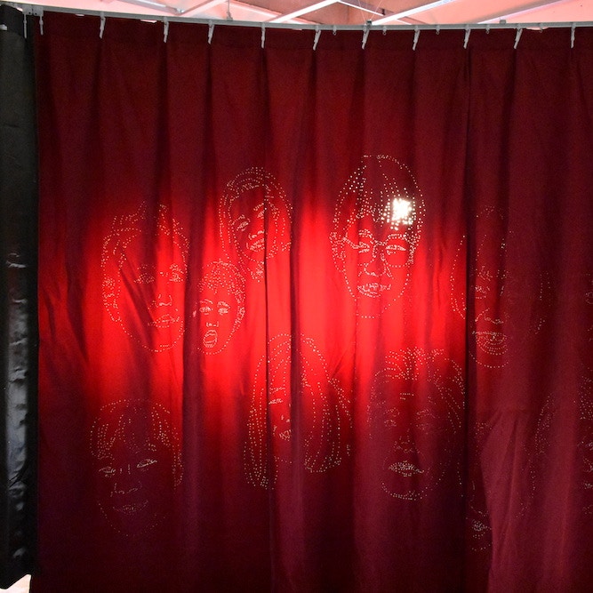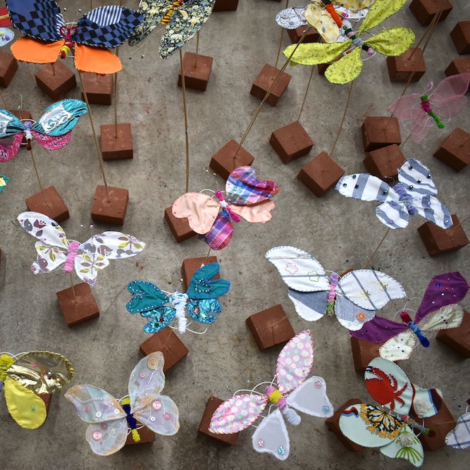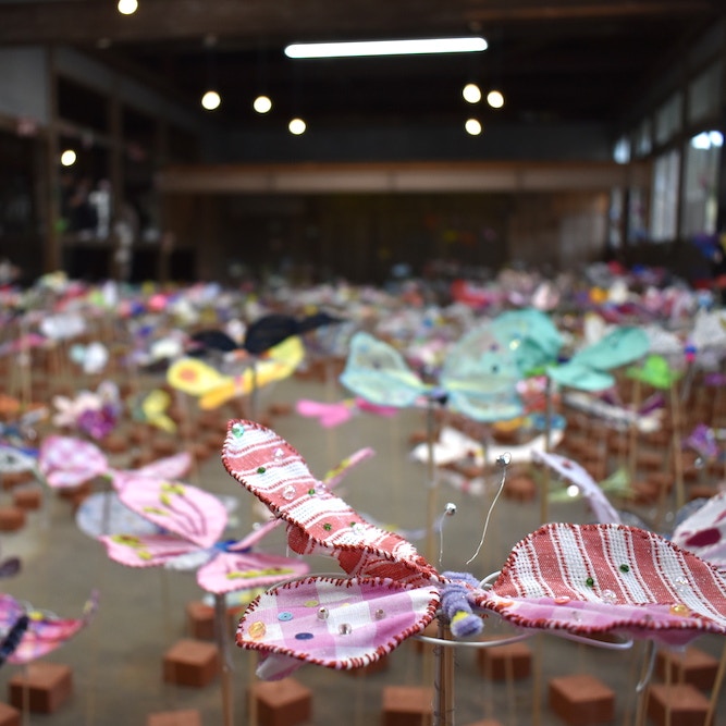 《蝶々と内田のものがたり》と題されたインスタレーションで並ぶのは、再生の象徴とされる蝶。1000頭以上に及ぶ蝶々は、すべてが古布やキルトでつくられており、旧内田小学校の卒業生や家族、市内の中学生など、多くの人々によって生み出された。そこには、かつての小学校の賑わいを取り戻すような光景が広がっている。