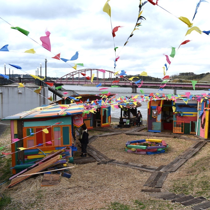 また屋外には、地域から出た廃材などを使用し、地元の人々とともにつくりあげたカラフルなマルシェも。クラフト作家などが参加し、湖畔に個性的な空間が展開されている。足湯などもあり、旅の疲れを癒すこともできる。