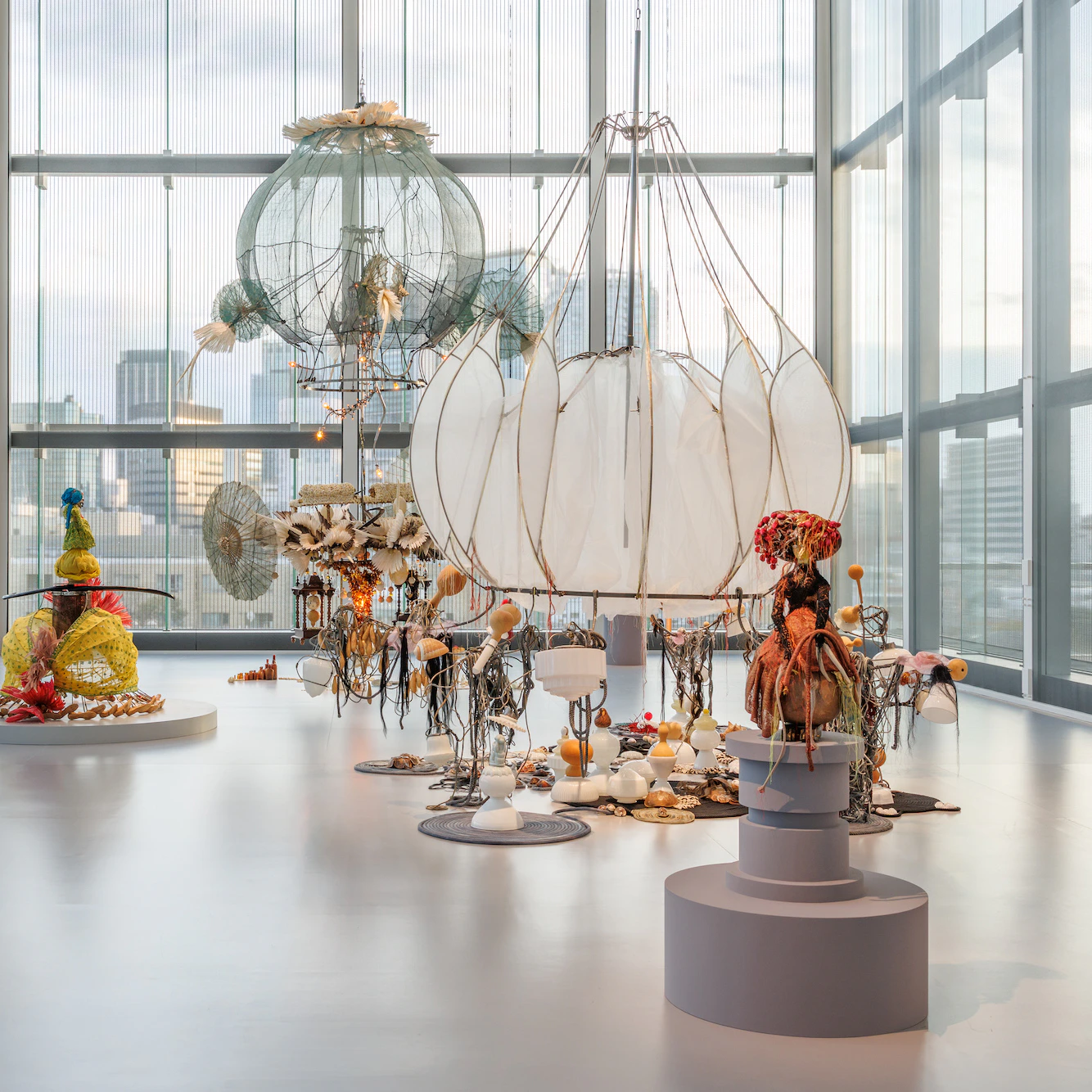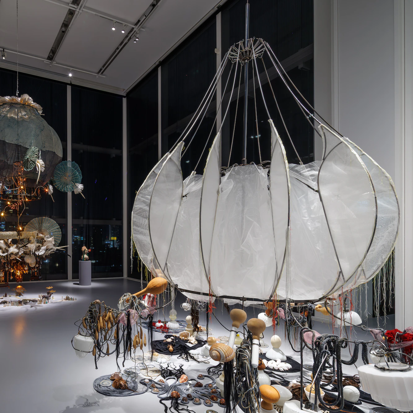 バネルジーが選ぶ素材は、綿糸、ココナッツパウダー、テキスタイル、ダチョウの卵、羽根、ガラスのシャンデリアなど、いずれも固有の来歴を持つ。バネルジーはこうしたグローバル・サウス(作家はこれを「熱帯地域」と呼ぶ)産の日常品と、植民地主義の文化的・物質的残滓を反映する要素が混在するインスタレーションや立体作品群を制作してきた。
