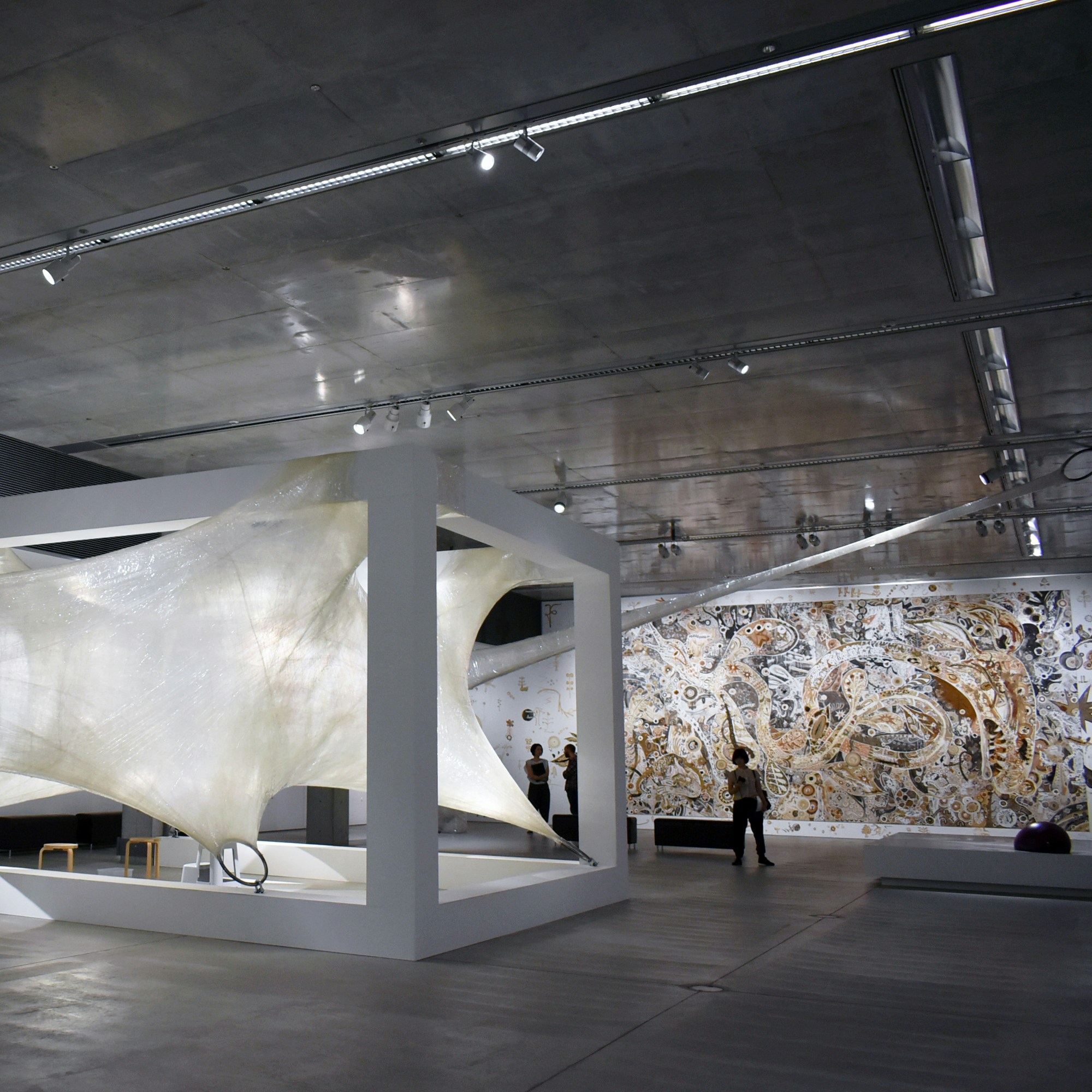 また、舞台芸術やインダストリアルデザイン、コンセプチュアル・アートの領域で活動しているアーティスト集団「ヌーメン/フォー・ユース」は、2万メートルもの透明なテープを使い、空中に浮かぶ通路《テープ・トウキョウ02》を出現させた。来館者は実際に空間の中に入ることもできる。