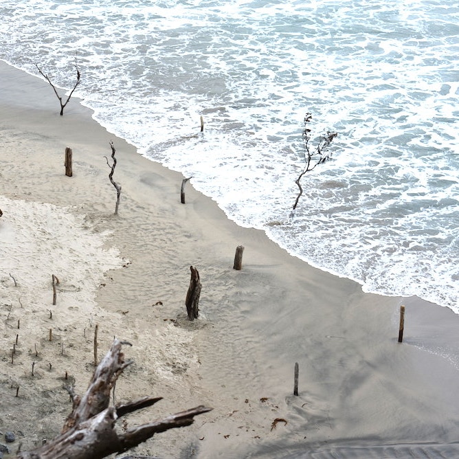 国立公園という制約上、人工物を一切設置できず重機も使えないこの場所。「倒れた木をReborn、つまり元ある方向に立ててみようと。だから完成形があるわけではなく、会期中に来た人も立ててくれたらいいなと思っています」。その言葉通り、砂浜にはいくつもの流木、倒木がただ立てられているだけ。眼前に広がる海と立っている木々。このプリミティブな風景に何を感じるだろうか。