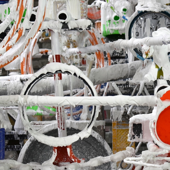 震災の被害が特にひどく、ほとんどの建物が流されてしまった南浜地域。そこで姿を留めた、ただ2つの倉庫の片方を使ったのが金氏徹平だ。4トントラック150台分の膨大な瓦礫に埋め尽されていたという倉庫。ここで金氏は、様々なオブジェクトを積み上げて石膏を被せることで、それらを一つの抽象的な彫刻に変容させる「White Discharge」の最新作を展示している。