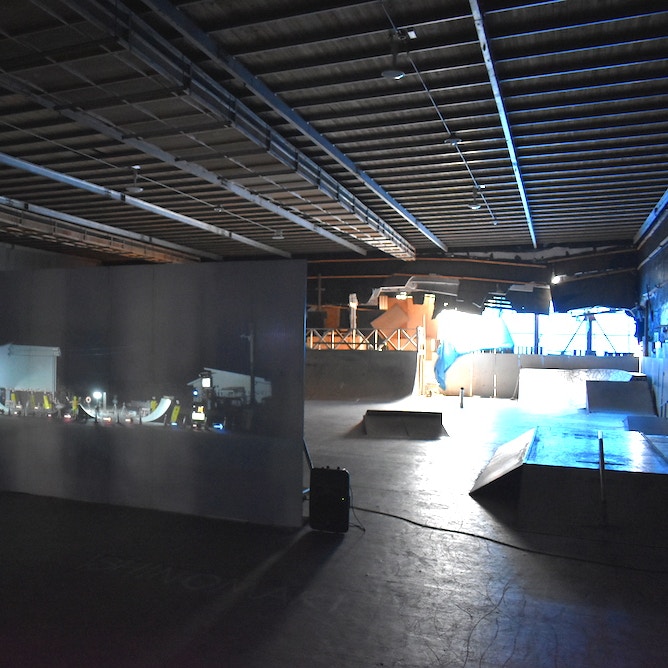 EVERYDAY HOLIDAY SQUADはここで夜間工事現場とスケートパークを融合させたパフォーマンス映像を含む巨大インスタレーション《rode work》(2017)を展開。このほかプロスケーター・森田貴宏が建物の周囲にスケートコースをつくるなど、ストリートカルチャーによる状況への介入を提示している。