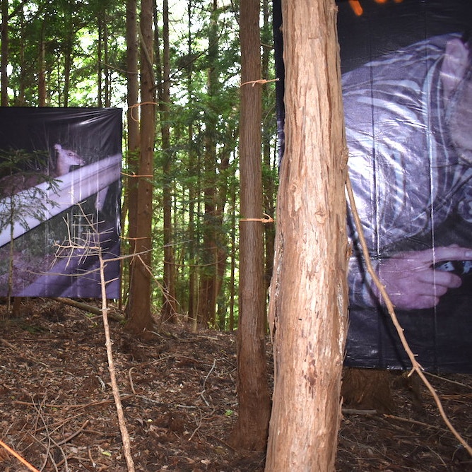 30年以上前に廃校した旧桃浦小学校がある山の中。作品が設置されているとはとても思えない環境に、コンタクトゴンゾの作品は点在する。森で実際に生活しながら作品を制作した彼らは、深夜にコバルトライン(牡鹿半島を縦断する国道)を運転し、そこで数々の写真を撮影した。これを引き伸ばし、ペインティングを施したものが《鹿ウォッチャーと深夜ドライブ(と彼の安全な家)(と彼の裏庭の手作り神社)(=テリトリミックス)》(2017)だ。ガードレールや標識といった人工物と、鹿や猫など自然の生き物たちが混在して写り込んでいる写真の数々。コンタクトゴンゾ主宰の塚原悠也は「自然の中で長く生活していると、人間がつくった直線的なものに目眩がしてしまう。そこで、自然の中に直線を持ち込んだらどうなるかと思い、ガードレールに着目しました」と語る。
