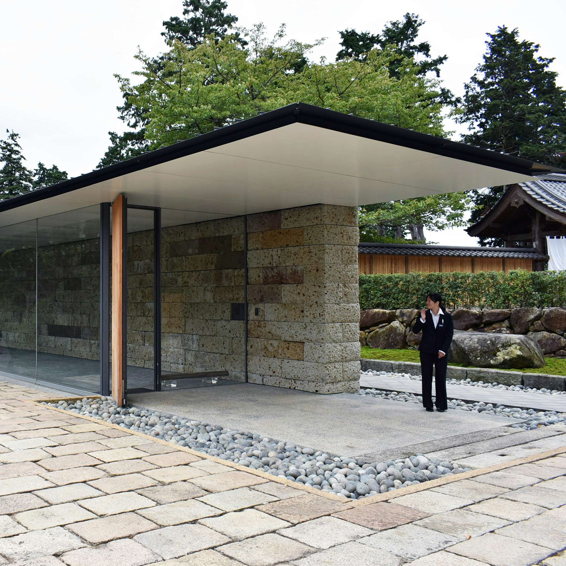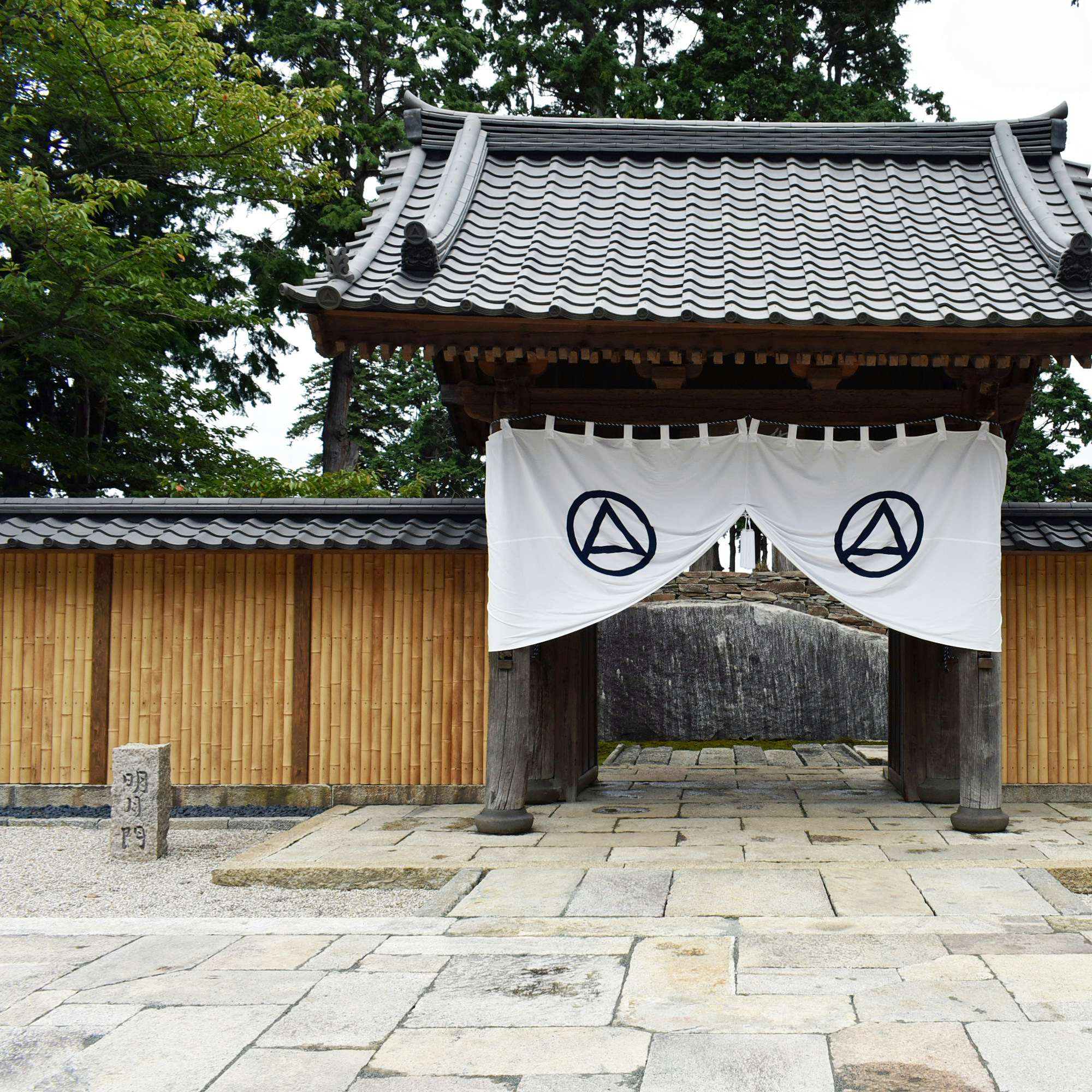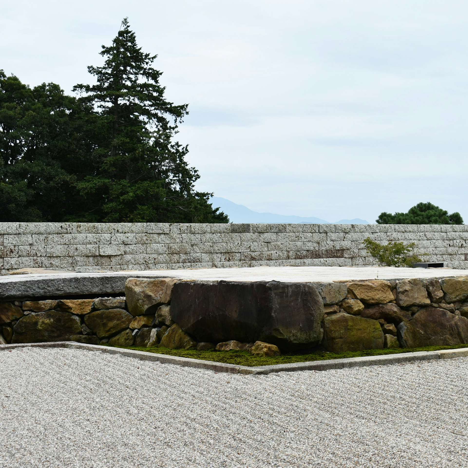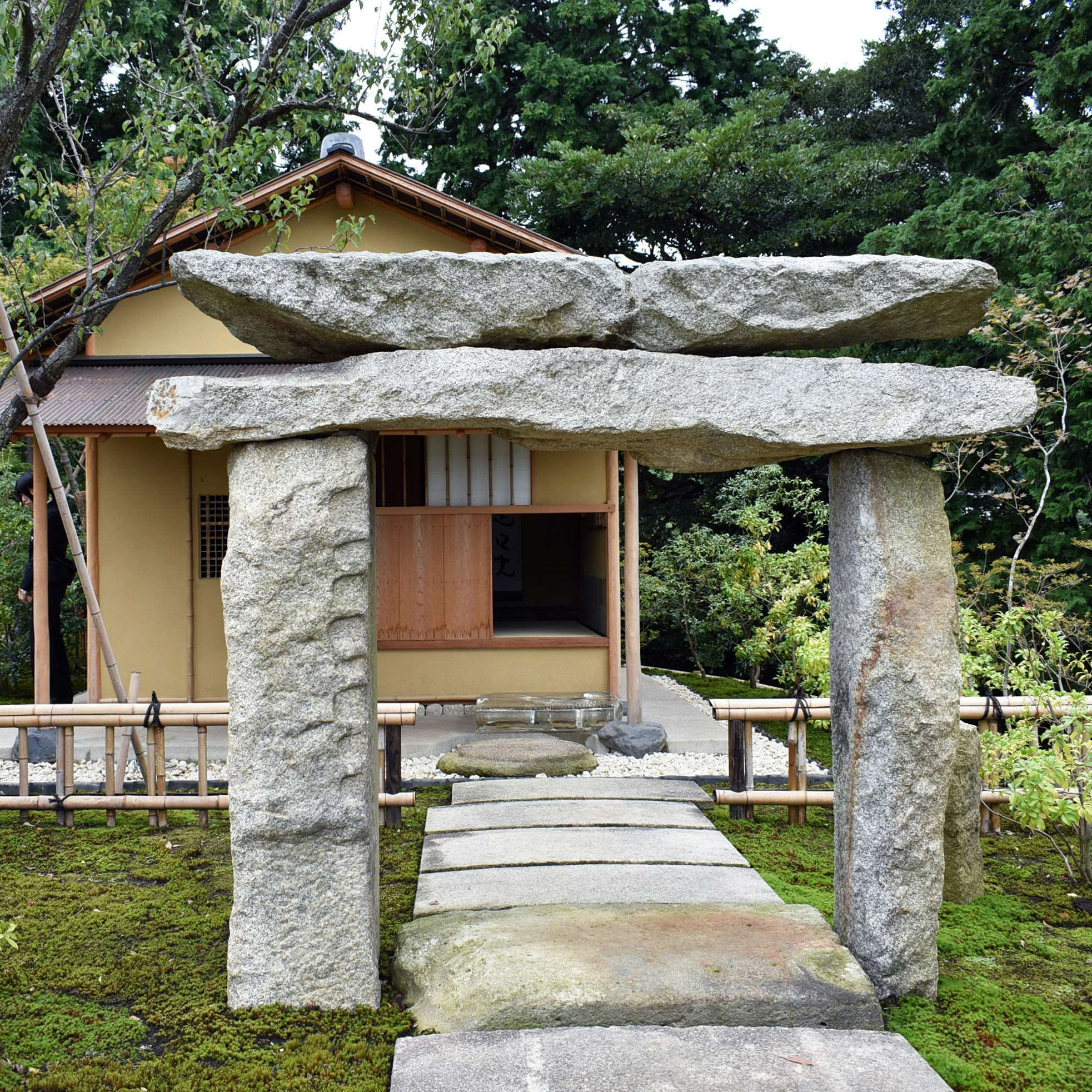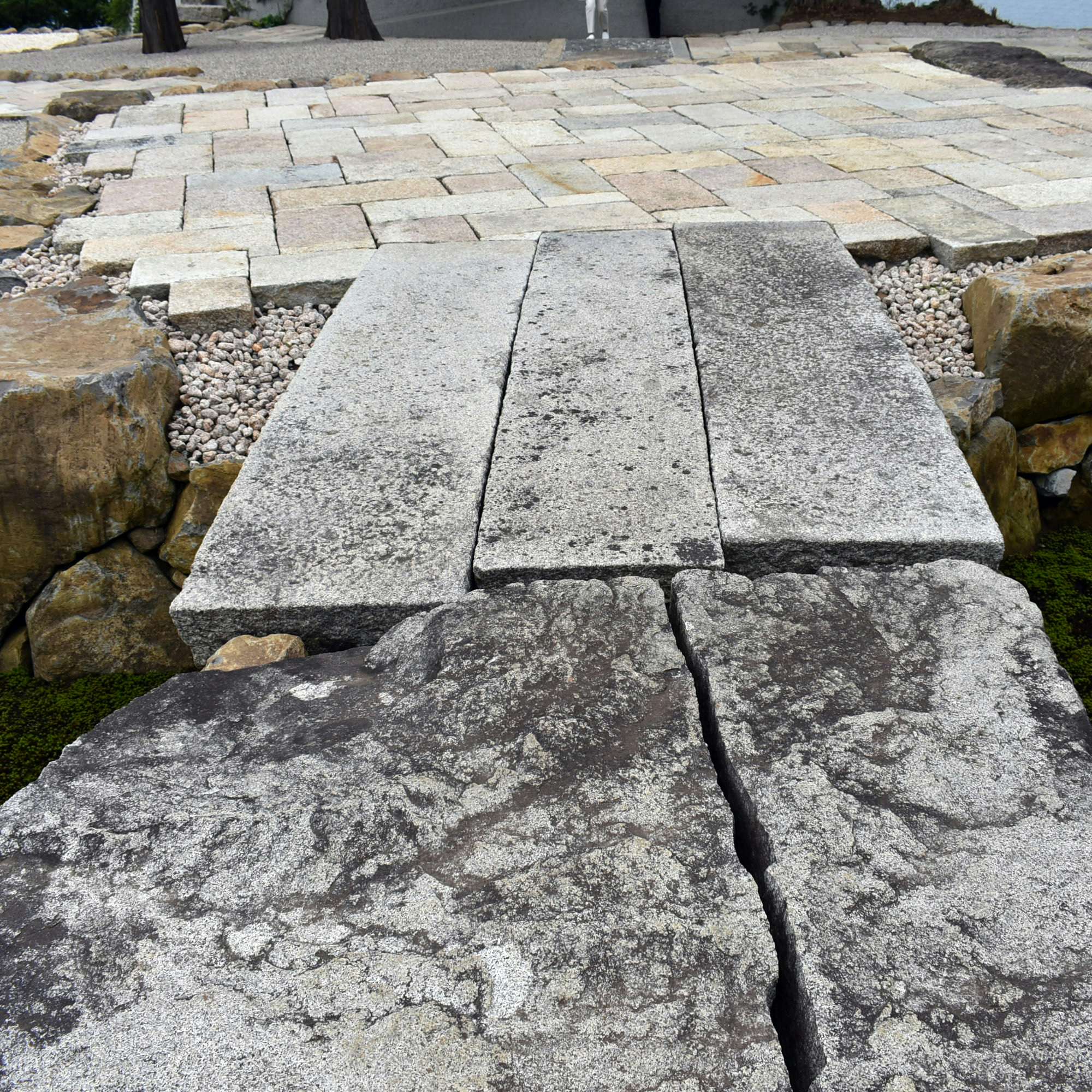 敷地の中ほどには石舞台があり、石橋の軸線は春分秋分の朝日が相模湾から昇る軸線に合わせて設定されている。