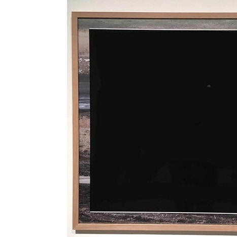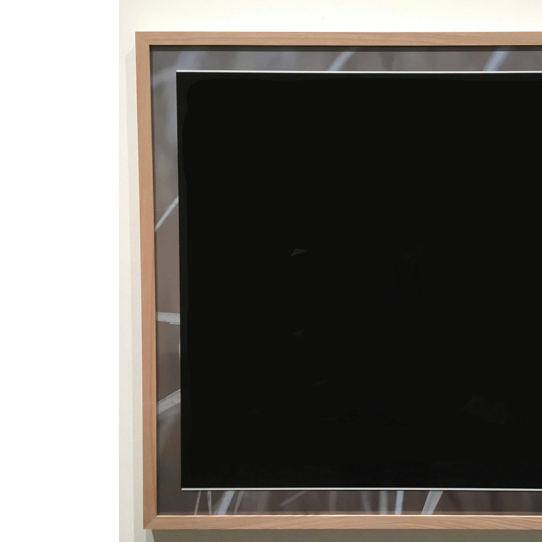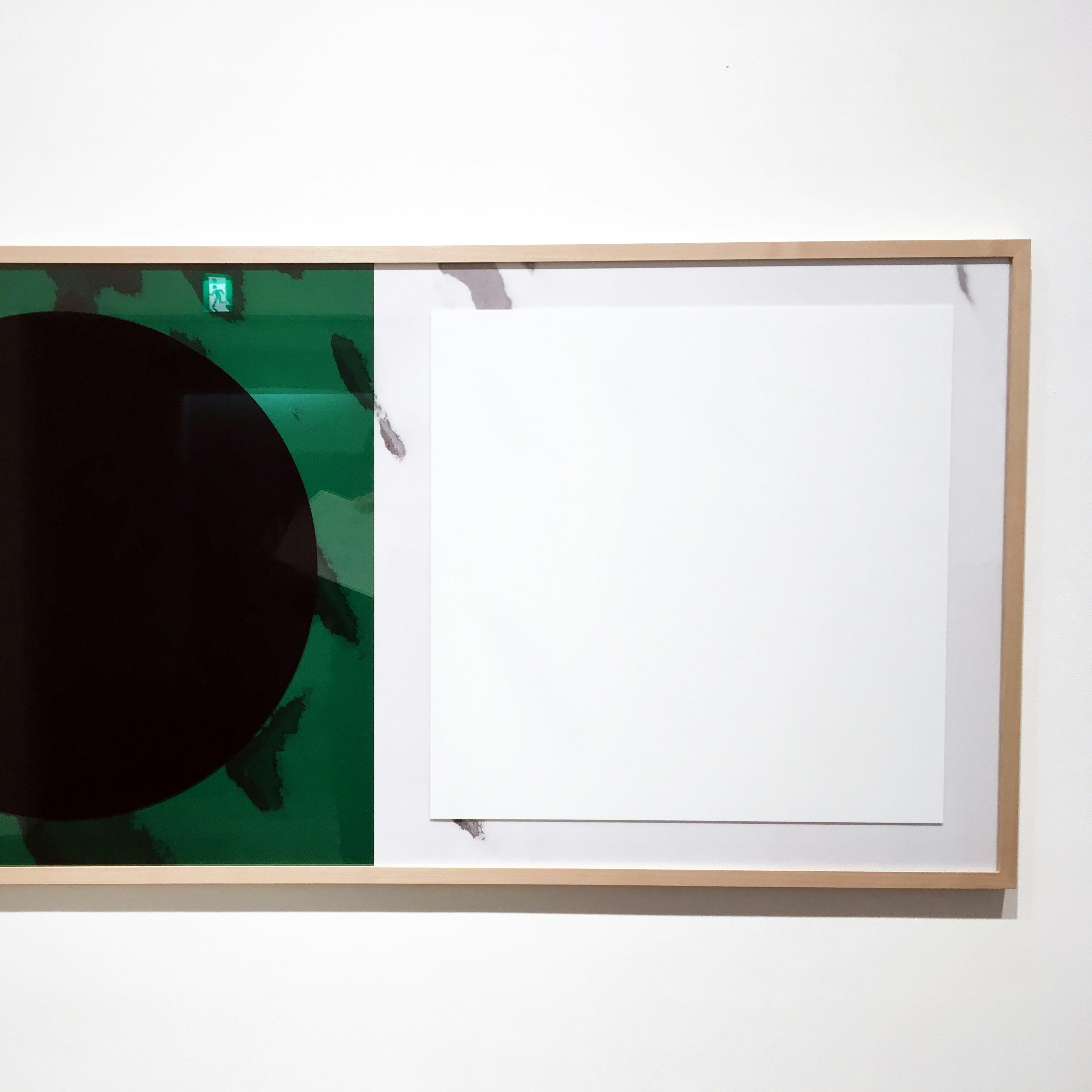 例えば《2018.2.2 #3》と《2018.2.2 #4》という作品。両者とも平面上エッジに沿って四角の枠取りがあるため窓を思い起こさせる。だが、枠状の部分はある風景の写真であり、真ん中の部分はガラスにシルクスクリーンが黒く刷られたものなので窓ガラスと違って透明ではない。したがって、枠が風景に、枠の内側が黒く不透明になっている点で、通常の窓における枠と、風景が見えるガラス部分とが入れ替わったものだと言える。そして、実は黒いガラスは写真の上に置かれているだけなので、写真と黒ガラスは積層状態になっているのである。