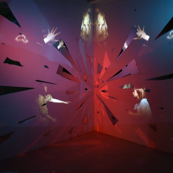 前者の《Ghost》では、4面のスクリーンにそれぞれ、黒いジャケットを着た男性の手と情熱的に抱き合う/激しくもみ合う/涙を慰められる/優しく抱き合う女性の姿が投影され、向かい合う鏡面に反映像が映る。だが、じつはこれは女性の一人芝居であり、愛撫や慰めを与えてくれる男性の「手」は、自らの片腕を男物のジャケットの袖に通すことで、女性自身が演じていたことがラストで明かされる。女性を消費主体とする少女マンガや恋愛ドラマにおいては、男性は「不在」であり、自己の願望が投影された分身にすぎないというナルシスティックな幻想の回路が、虚実を曖昧に融解させる鏡という装置を用いて暴かれる。