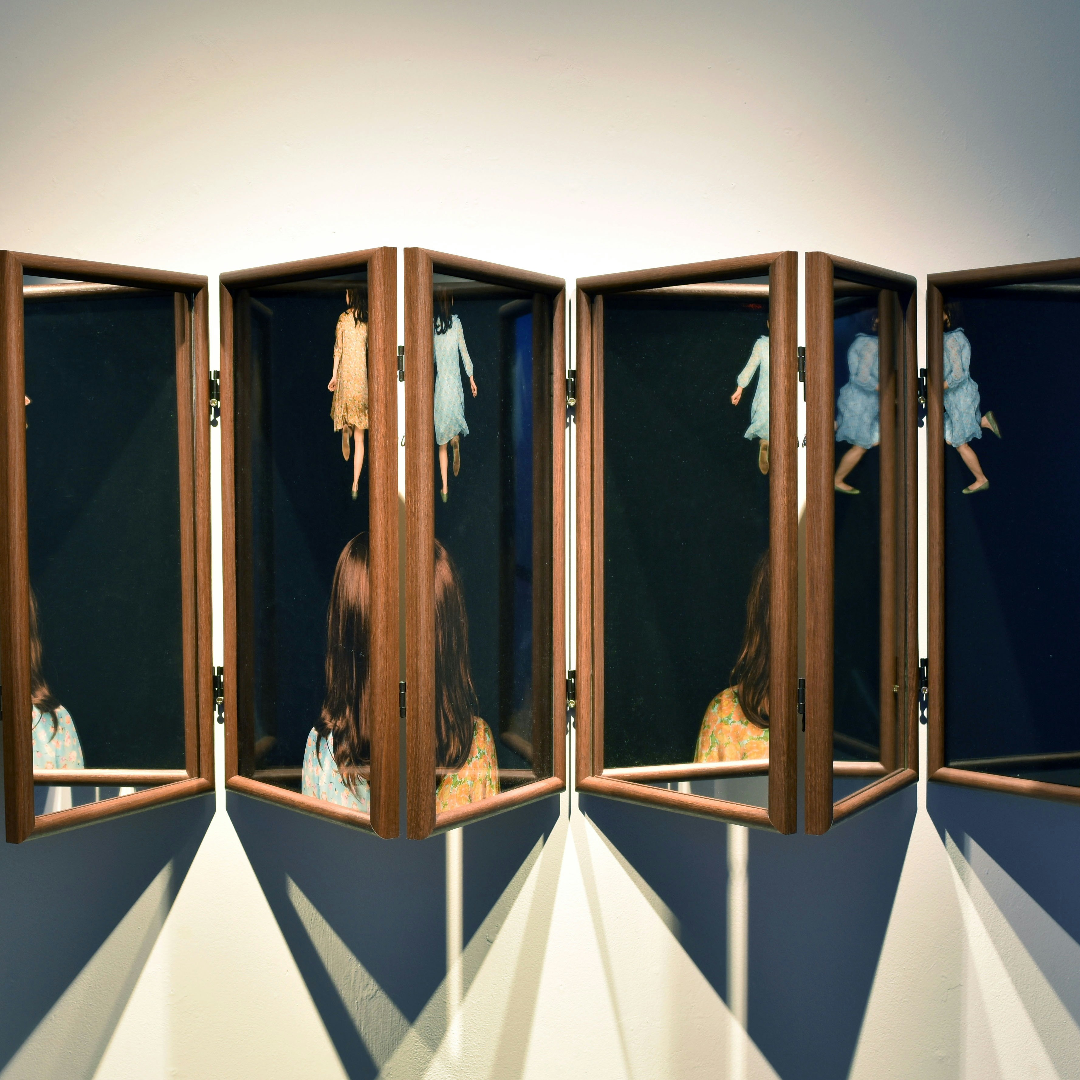 また、《デカルコマニー | Decalcomanie 3》(2018)では、8面のフレームを蛇腹状に設置し、向かい合った面の片側に写真を、他方に鏡面を配することで、女性のポートレイトが鏡の反映と分裂・増殖を繰り返し、自己/他者の区別が曖昧に融解した回路をつくり上げていく。この鏡面を互い違いに用いた蛇腹状の構造は、《Ghost》(2015)のそれを踏襲するものであり、また自/他の区別の曖昧さは、《間―あいだ》(2011)とも共通する。