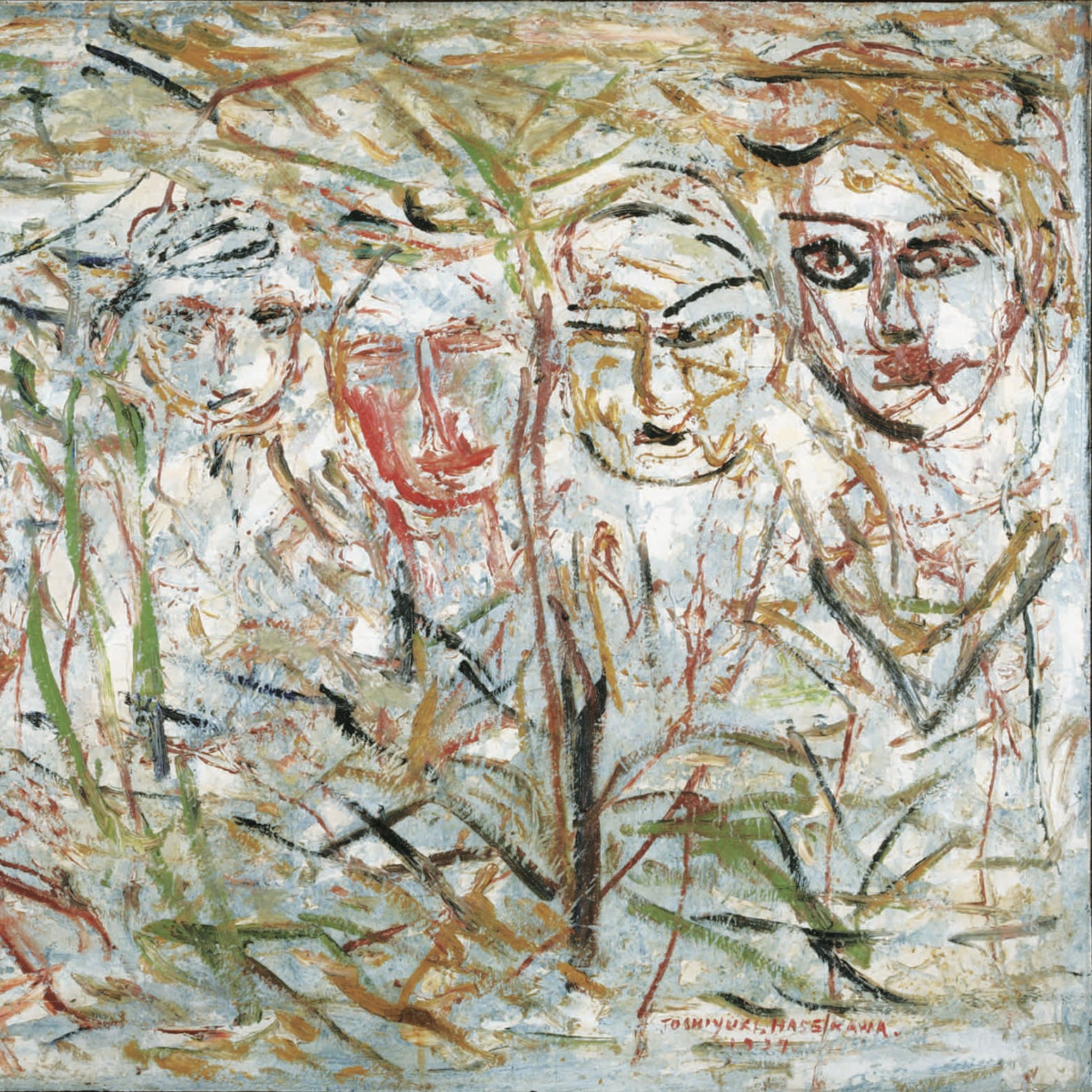 新出の《カフェ・パウリスタ》や《白い背景の人物》が重要なのは、それが、長谷川が獲得しようとしていた特異な「方法」を示しうる点にあるだろう。矢野らが形容するように、長谷川の作品は「台風」や「嵐」のような勢いで描かれた。じっさい長谷川の絵画を見れば確認されるように、絵画制作における速度の重視は、塗ることを抑圧し、筆触というよりも線的(文字的)な筆跡に似た、ストロークの反復を導く。つまり速度への接近は、描写と筆触の多様性を抑圧し、同一パターンの分布を生じさせるのだ。しかもその絵画では、作品毎に異なるストロークの幅の同形性が見出される。晩年の様式にみられるのは、画面に白い地塗りをしたあと(あるいは下地すら施すことなく)線の散布によってイメージを立ち上げるという方法である。それは、絵画を覆う、ざっくりとした筆触の網、「筆触網」のような構造を画面に与える。それは、隙間に満ちた空間である。