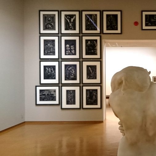 明治洋画の草分けである山本芳翠の作品を核に、同時代の国内の作品とフランスの作品、それぞれと織り交ぜつつ段掛けにした第1章「明治洋画パノラマ展望」には、我が国における美術館黎明期の姿——例えばフランスへ留学する直前の芳翠も出品した1887年「第一回内国勧業博覧会」の美術館(Fine Art Gallery)で明治の人々が目にした、天井に向かって何段にも絵画が掛けられている様子——が、遠く重ね合わされている。現代の感覚からすれば異質な絵の掛け方は、続く第2章、芳翠と同じ師ジェロームに学んだルドンの、あえてずらした版画の並び(前期のみ)や、第3章冒頭の開口部を除く壁面全体を埋め尽くすルオーの版画集『ミセレーレ』へと、かたちを変えながら引き継がれてゆく。また逆に、第4章では新天地タヒチの気配を刻み込んだゴーギャンの木版画と、熊谷守一が赤い輪郭線を自らのものにしてゆく過程が、第五章では明治末から大正にかけてのモダンな空気が、それぞれ壁面据え付けの展示ケースの中に、静かに閉じ込められている。美術が見世物と未分化だった時代に存在した複数の展示方法を併存させることで、本展は「美術館」が現代の姿になるまでにたどってきた分離の歴史——博覧会の展示区分による書・画の分離や、美術団体のための展示施設開放による殖産興業と美術との分離、あるいはガラスケースの内外における工芸と美術の分離——を、削ぎ落とされた側のものを並べることなく見事に物語っている。