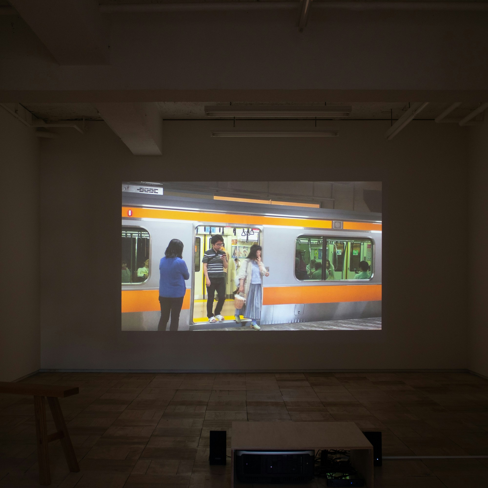 JR国分寺駅中央線のホーム。夕日が低いところから差し込むコンクリートの壁に、画面の4分の1ほどを占める大きさ(幅4メートルほどだろうか)のガラス窓が開いている。カメラのすぐ左前方に立っている女性の肩越しには、その窓の左側にある「まるい食遊館」の文字が見られ、どうやらホームからスーパーの食料品売り場が窓越しに見通せるようになっているようだ。窓の向こうに並べられた椅子に男性がこちらに背を向けて座っているのが見える。電車の走行音が聞こえたかと思うと、オレンジ色の帯とともに中央線の車両が画面左から手前の女性と奥の男性のあいだに滑り込んでくる。窓は完全に隠され、しばらく女性と停止を始める車両だけが画面を占め、ドアが開くと女性が乗り込み、車両がホームを抜けるとさっき座っていた男性がいなくなっている。