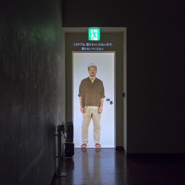 来館者が最初に訪れるのはおそらく、展示空間の片隅にある、非常口へと通じるドアの片面に、プロジェクション・マッピングで映し出された、contact Gonzo(以下、ゴンゾ)の塚原悠也だろう。ピナ・バウシュなどが得意とした、偶発的な接触を起点としたダンスを日本人の身体にカスタマイズしたダンサーが、「このドアは、開けちゃいけないので、開けないでください」と語りかけてくる。奇妙に淡白な調子で。平面の映像となったゴンゾが、わたしたちのからだを誘い、そして拒むのだ。相矛盾するフレーズは周到に仕組まれている。