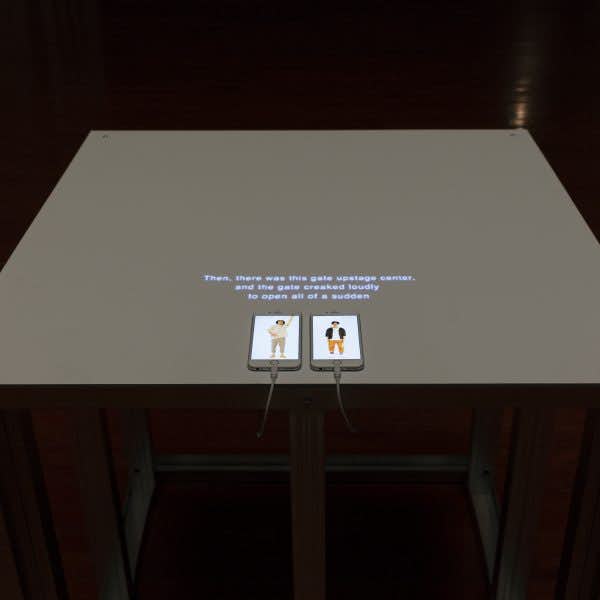 今日、モニター画面に語りかけ、また語りかけられている世界。それはまるでアニミズムが回帰したかのごとくだと、今日、先鋭的な哲学者が世界中でつぶやいている。〈映像演劇〉の作品のひとつは、そんなつぶやきを搦め手で弄ぶだろう。白いテーブルの隅にちょこんと並んだ2台のスマホ。テーブル手前には劇場で見かける仕切りの紐が張られていて、そこはまさに舞台であるかのようだ。やがて、2つのモニターに2人の役者が浮かび上がり、科白のやりとりをはじめる。寸劇か。でも、幕間のようなコメントもしている。まもなく、わたしたちの目は彷徨いはじめる。これは、映し出された役者がしている芝居なのか。はたまた、2つの画面のじゃれあいなのか。いや、もしかすると、デバイス同士のコミュニケーションなのか。わたしのアニミスティックな欲望は、漂い迷いはじめる。