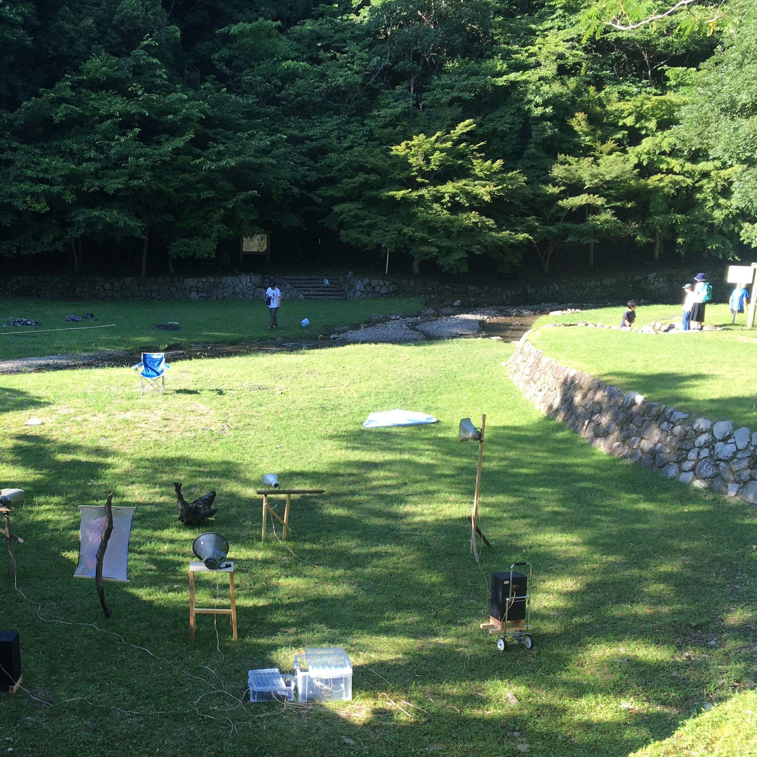 この展覧会における作家の介入に、それぞれ作品としての輪郭を見ることは困難である。彼らは展示空間のあちこちに様々な要素を設置する。写真は川の中に沈められ、木の枝から吊り下げられている。芝生の上に野外放送用のスピーカーが立てられ、滝の前には波形の図が掲示されている。それぞれの要素一つひとつに大きな意味は与えられず、断片的だ。しかしこの場に「断片」を挿入すること自体が、この場に対する有効な介入となっているように思えた。