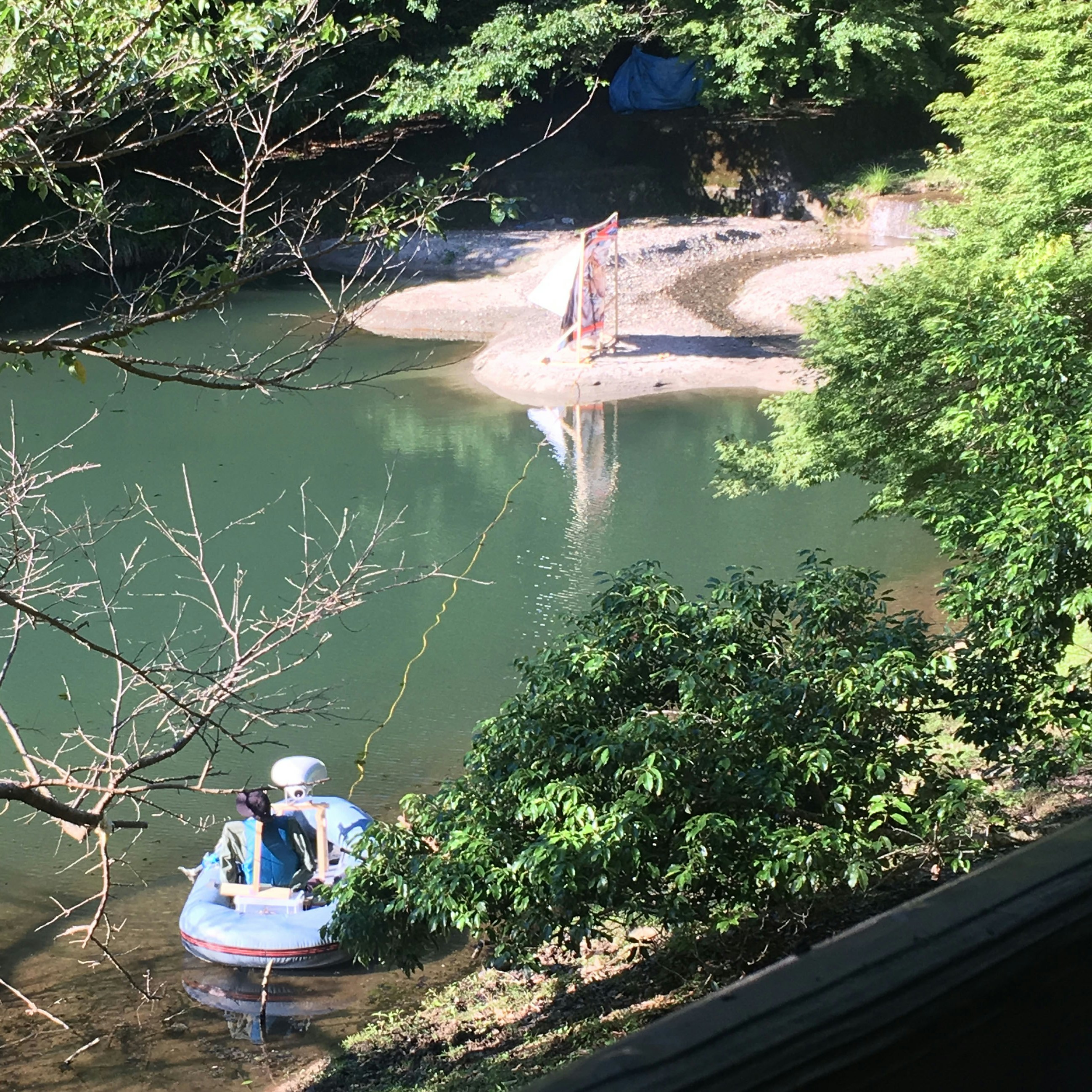 6月の湿った日差しのなか、上流を目指して川沿いを歩く。コンクリートで舗装された護岸はところどころ崩れ、土嚢が積まれている。靴底を濡らしながら砂利が混じったぬかるみを超えると、コンクリートで固められた壁が視界を遮る。その先から音が聴こえる。階段を登り壁を越えると、池に浮かぶゴムボートに乗った案山子と、風にはためく木製の枠に掲げられた写真が見える。案山子の頭に取りつけられた拡声器のようなスピーカーが、ノイズの混じる砂のような男性のささやき声を発している。