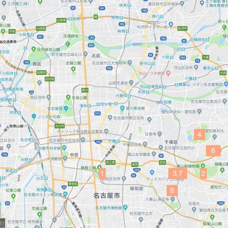 その空白を埋める発見には、愛知用水(木曽川から知多半島の離島部までをつなぐ用水路)の開発が関係しているのだが、それはほとんど名古屋都市圏の開発の時間軸とほぼ重なっている。都市開発の漸次線を見極めるには公園と大学の配置が重要だ。名古屋について言えば、中心部から東へと発展を追ってみると、恣意的ながらだいたい以下のようになる。