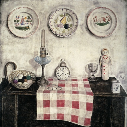 こんな風に驚異の細部への至近距離からの注視を強く求める画面だから、見る者は、左右でずれた肩や腰、長すぎる腕、パースのおかしい机の面といった大きなデッサンの崩れに気づかない。《すぐ戻ります(蚤の市)》(1956)は、2006年展でも出品し、あまり印象に残らなかった作品だ。しかし今回、マネキン、写真、古い版木、ドールハウスなど何十ものモノの表皮が描き分けられ、それらが奥行きのない空間を埋めて縦に積み上げられているのを見て、異なる表面を接ぎ合せるという藤田の造形原理を体現する典型作だと見直した。