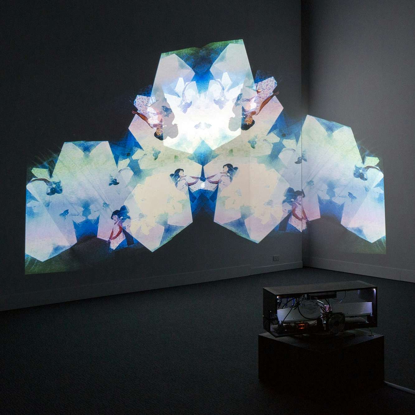 たいして暗室で展開された映像インスタレーション《よびつぎうつし》(2018)は、「1時間で1周するプロジェクターによって、360度の投影が展示室でおこなわれる。映し出されるのは、小金沢によって呼び出された、幽霊たちである」(*6)。たしかにそれは映像の回転機構が露出しており、部屋に展開される――プロジェクターの投影範囲だけでなく、すべての壁が同時に潜在的にスクリーンでありうるという意味で――映像の幽霊を可能にするオペレーションの存在が鑑賞者に開闢されており、奇術的だといえる。それに人物をおぼろげにコラージュした映像もまた不気味で、たしかに「マギカ」である。だが同時に、その音すらしないゆっくりでスムーズな一定速度の自動回転は、影絵や写し絵におけるぎこちない手動のアニメーションの補完、間の悪さ、あるいは即興的に手をかざして光を乱すようなぐだぐだ=しわだらけ(seamfulness)とは異なる、稠密の「卒なさ(seamlessness)」をもっている。