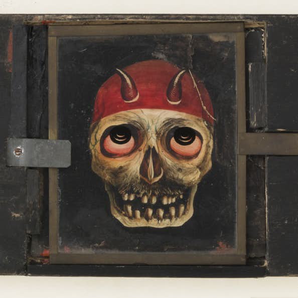 いわば「マギカ=魔術」から「マジック=奇術」へと、展覧会の重心は手品のコインのように移動しはじめる。光学的洗練と幻影を譬喩した「魔術」から、機構をオペレーターが扱うという事実も含みこんだエンターテインメントたる「奇術」へと〈瞬間移動〉するための〈種〉として、ゾートロープ、影絵、後述するファンタスマゴリア、そして展示中盤には「写し絵」の紹介映像があるのだ。つまり本展の骨子は、ジョルジュ・メリエスとゾートロープとを〈別のしかたで〉結びつけるメディア=メディウム=仲介手段として、マジック・ランタンとファンタスマゴリアを召喚する点にこそある(*3)。