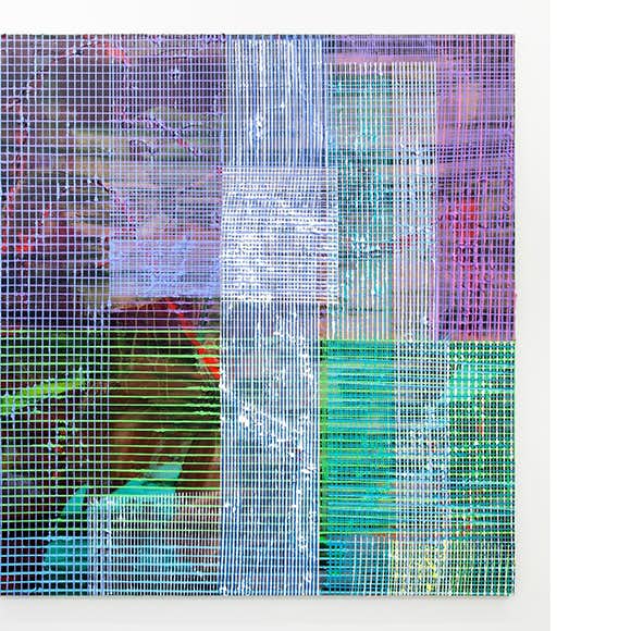 逆に、下方では線の群れが密になり、不透明な色面と化し、小さな絵画が貼り付けられているような感覚も生まれる。この感覚は、画面の両端まで届く横方向の線と、画面内に片端もしくは両端が収まり浮遊するような縦方向の線と対照されることで、画面のスケール感を惑わせる。画面を見続ける視線は、安定した視野を獲得することなく、つねに変化し続け、映像的な感覚を湛えた、伸縮自在な画面を彷徨い続ける。