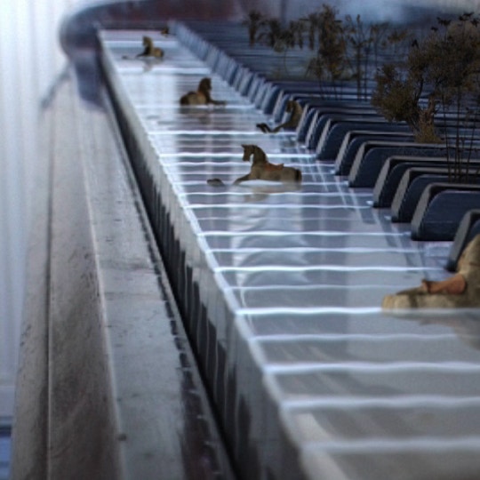 また、《Going Places Sitting Down》において、「そして僕は君に別れを告げたんだ」というフレーズのなか、映像内の木馬は家具の表面を進み、「青いノートが出てきたのはそのときでした」とピアノの鍵盤上にとどまり前後に揺らぐ木馬の姿が重なる。