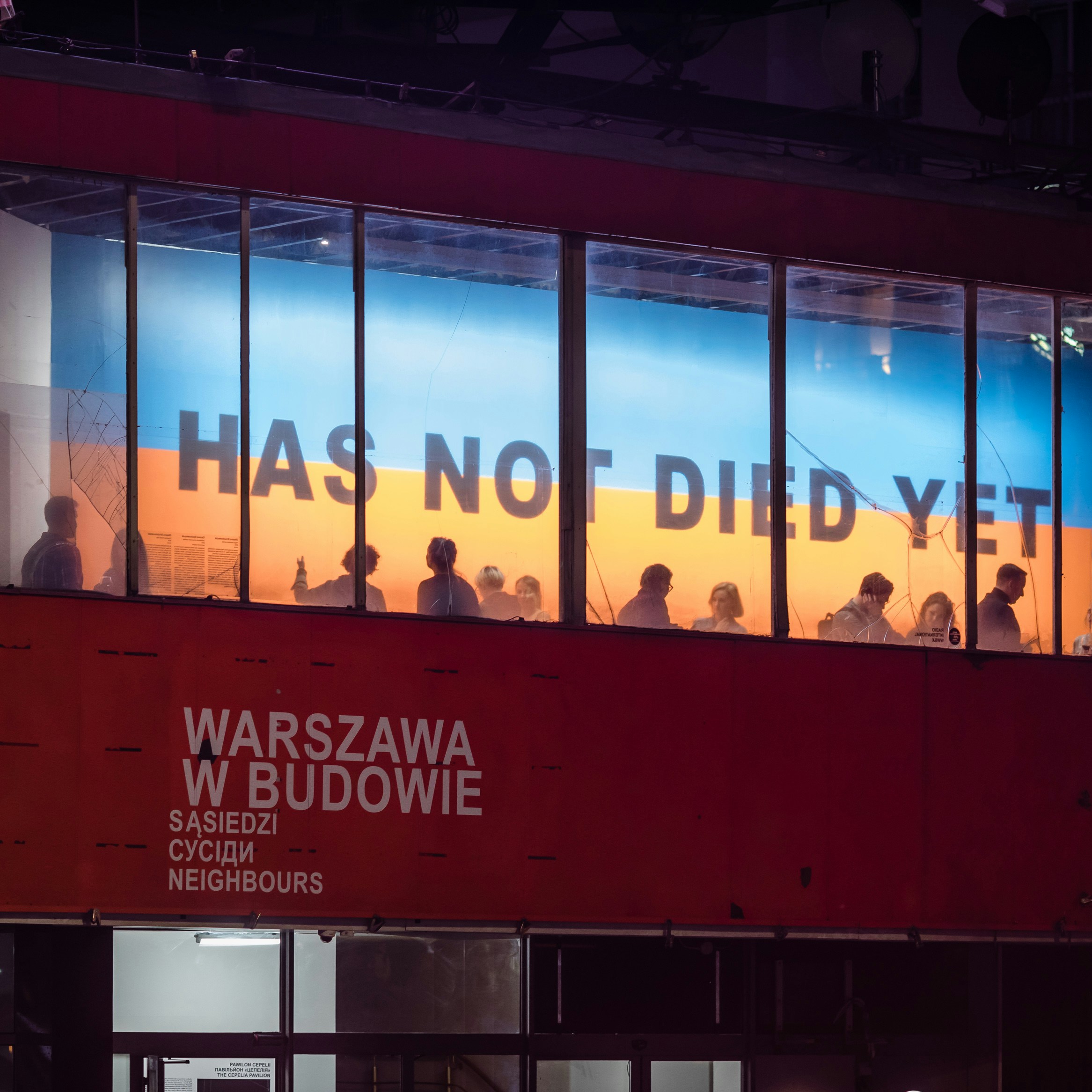 *3ーーワルシャワはポーランドの首都であり、キエフはウクライナの首都である。会場の外からも見えるオクサナ・ブリウコベツカの壁画《ウクライナとポーランドの国旗》(2018)は、タイトル通りポーランド(白/赤)とウクライナ(水色/黄色)の国旗を「混色」し、「HAS NOT DIED YET(まだ死んでいない)」と書き綴ったものであった。