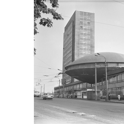 ユリエフはシベリア出身の建築家であるが、それ以外にもアーティスト、詩人、批評家、作曲家、バイオリニスト(!)といった多彩な顔を持つ人物である。もともと抽象画も手がけていたユリエフであるが、社会主義リアリズム全盛の共産主義下においては、建築を通して創作を展開する。彼は、1956年から76年にかけては「キエフプロジェクト」のチーフアーキテクトとして働き、ある画期的な建築を設計することとなる。ソ連の輝かしい「宇宙時代」(*5)と、モダニズム建築の結晶たる建造物/情報研究所、通称「UFO」である。