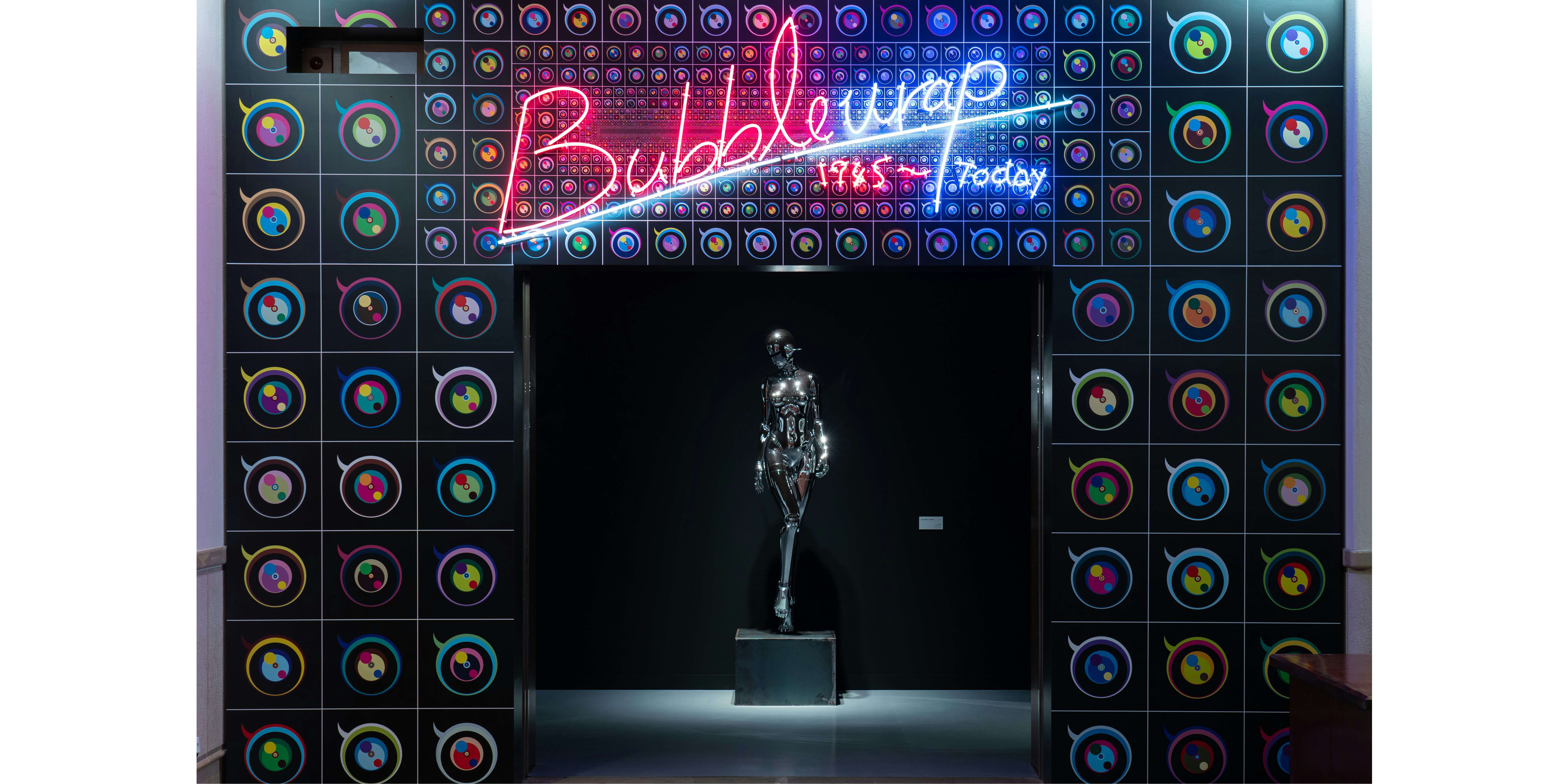 展示風景より、中央:空山基《Sexy Robot_Walking》(2018) © Hajime Sorayama, Courtesy of NANZUKA エントランス:© 2018 Takashi Murakami/Kaikai Kiki Co.,Ltd. All Rights Reserved.