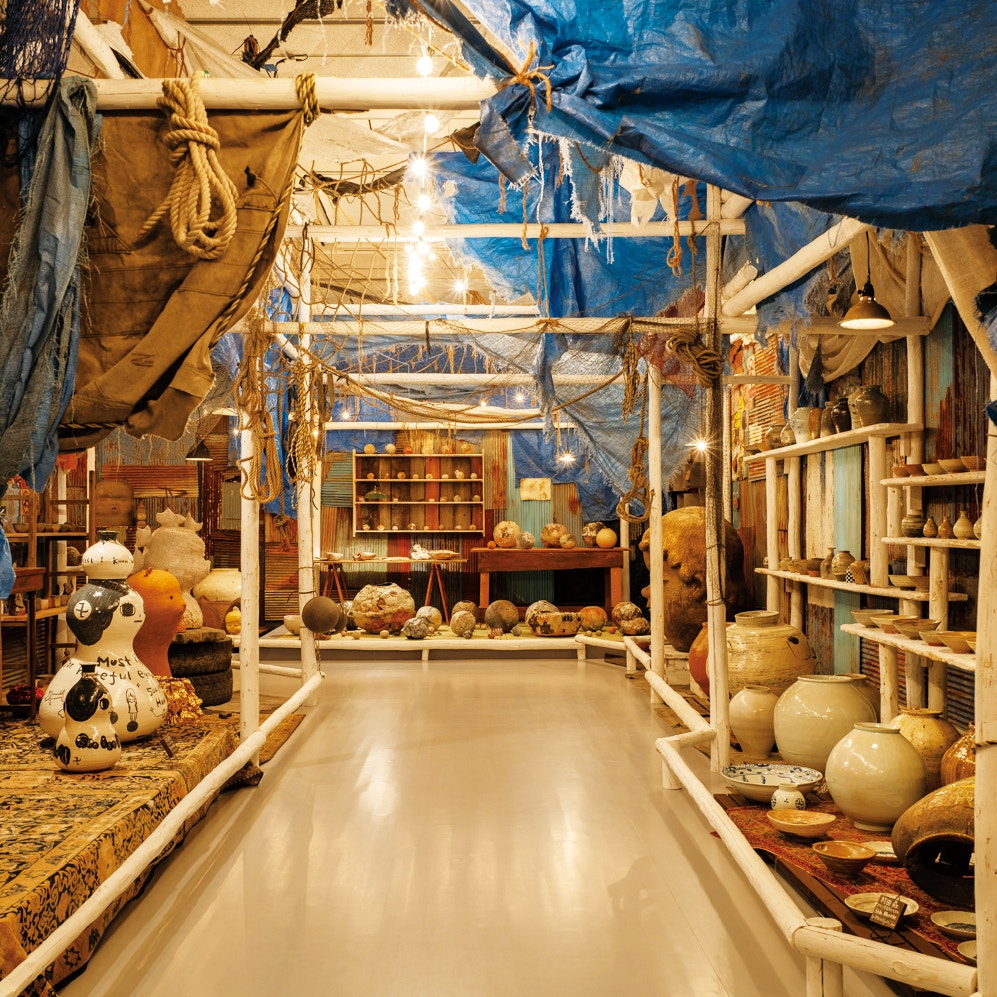 これに対して、その「集約」の「動機」について、もっとも端的に伝えていたのは、現時点では図録もなく、会場での展示にまつわる文脈も明示的でないことが一部で批判されているようだが、それらの声に反して、むしろ圧倒的に村上隆の「バブルラップ」展のほうである。なにせこの展覧会は、あまりに長いので省略してしまったが、展覧会タイトルに、その趣旨がこれ以上なく説明的に組み込まれている。つまり、そのあとに続く「「もの派」があって、その後のアートムーブメントはいきなり「スーパーフラット」になっちゃうのだが、その間、つまりバブルの頃って、まだネーミングされてなくて、其処を「バブルラップ」って呼称するといろいろしっくりくると思います。特に陶芸の世界も合体するとわかりやすいので、その辺を村上隆のコレクションを展示したりして考察します。」も含んで、正式タイトルは初めて成り立つ(チラシや会場のバナーもすべてそうなっている)。