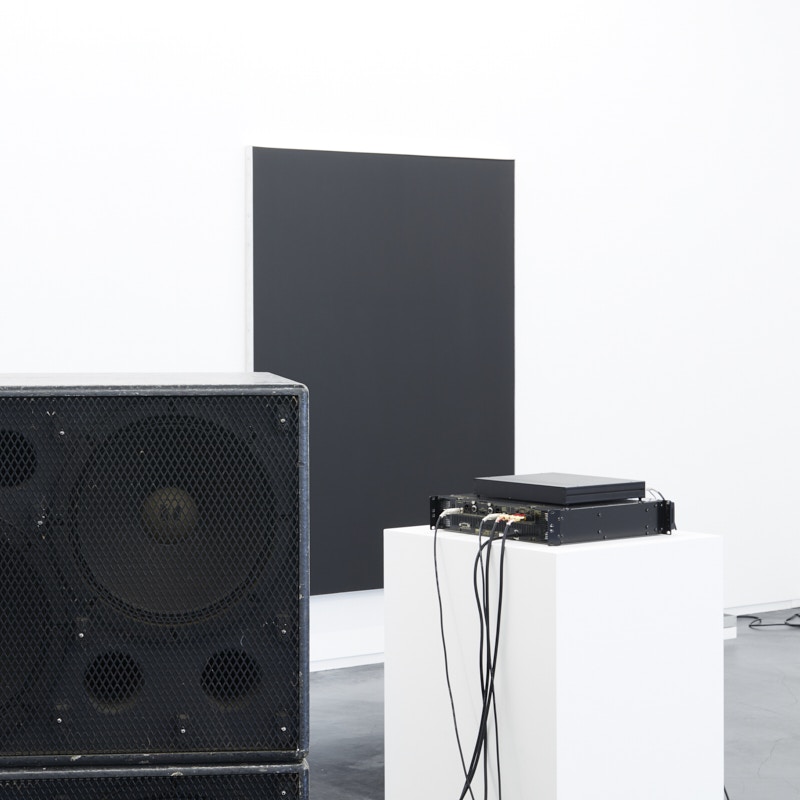 マリオ・ガルシア・トレスの個展「ともに時を落ちていく」は、この少し先の未来を予感させる無音のノイズで我々を迎い入れる。壁にはスピーカーの内側を思わせる真っ黒な絵画。その傍らで明滅する小さな赤い光は、何かのビートを刻んでいるのだろうか。奥に置かれたテレビモニターからは、ライブ映像やボクシング中継、またニュース映像のようなものが流れている。