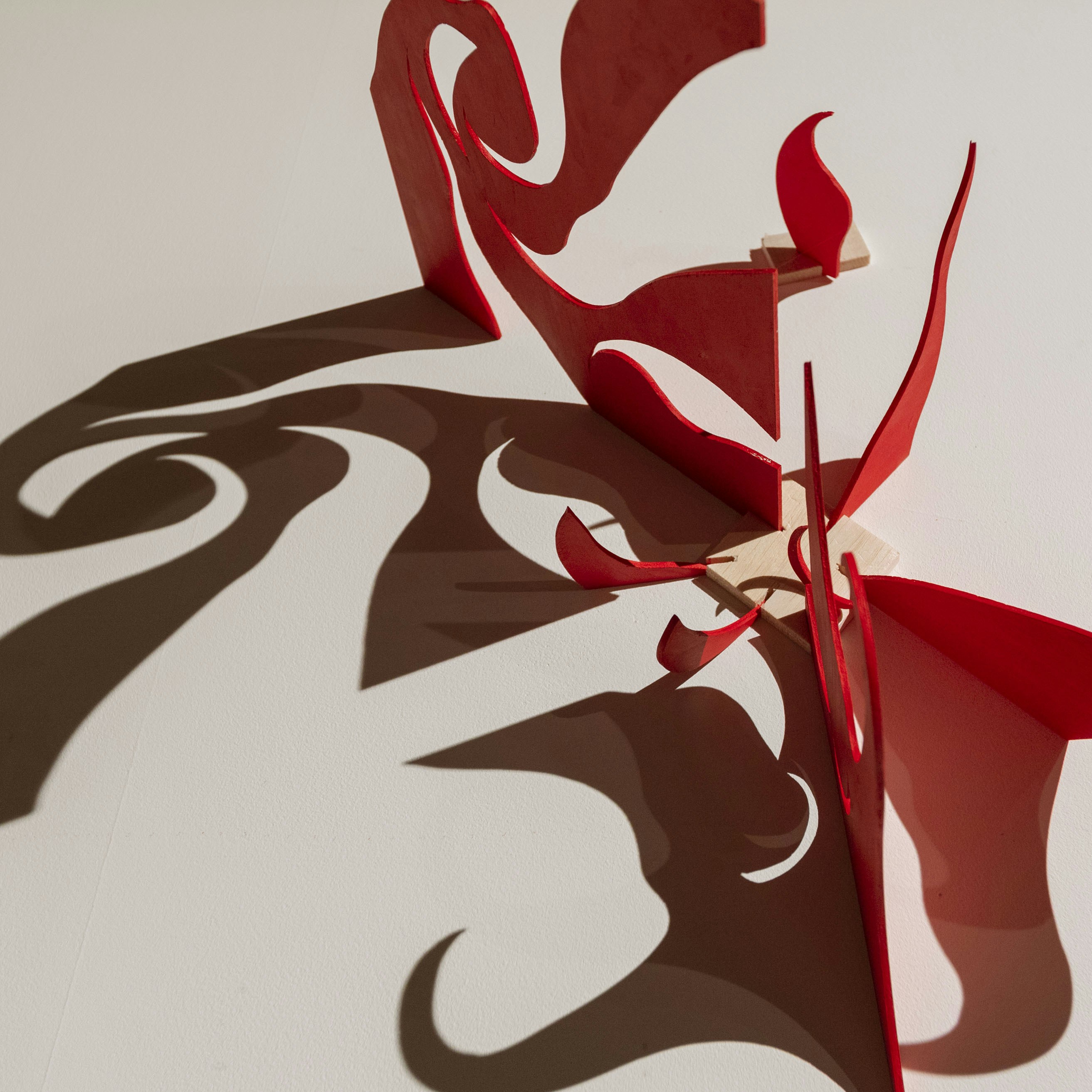 とはいえわれわれは、突如として現れたこの作家の彫刻作品を、いったいどのように受け止めればよいのだろうか。手がかりはいくつかある。まず、展覧会リーフレットでも明示されているように、比率4:3のベニヤ板を用いた本作に、映画の「フレーム」への参照が見て取れることは明らかだ(いうまでもなく、これは映画のスタンダード・サイズと同じである)。また、彫刻本体よりもその影を浮き立たせるべく設えられた照明は、この作家がしばしばモチーフとする映写機の「プロジェクション」を連想させなくもない。これはともすると牽強付会な印象を与えるかもしれないが、同作品から派生した《ダンス》という作品に目を向けてみれば、ここでの主役が投影された「光」であることは一目瞭然である。