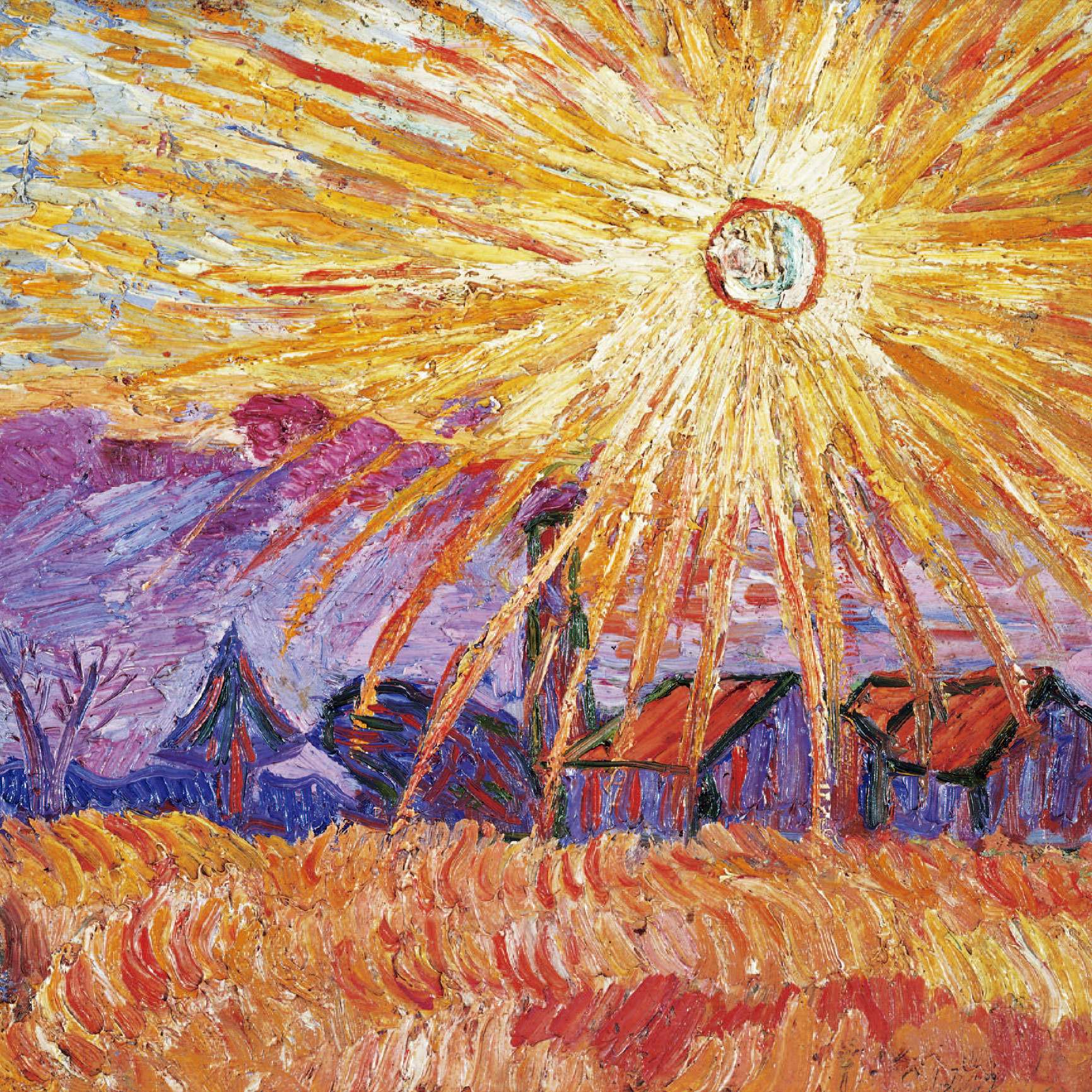 どういうことか。冒頭の問いに対してまず思い浮かぶ回答は、太陽の位置や空の色といった自然現象の再現的な描写を通じて、だろう。実際、本展出品作の多くは太陽を地平線に近い低い位置に描くか、あるいは雲や山並みや木立で遮って太陽そのものは描かないにしても、少なくとも光源を画中に置く。したがって、当然のことながら画面のなかのあらゆる事物は背後から照らされ、逆光の状態になる。