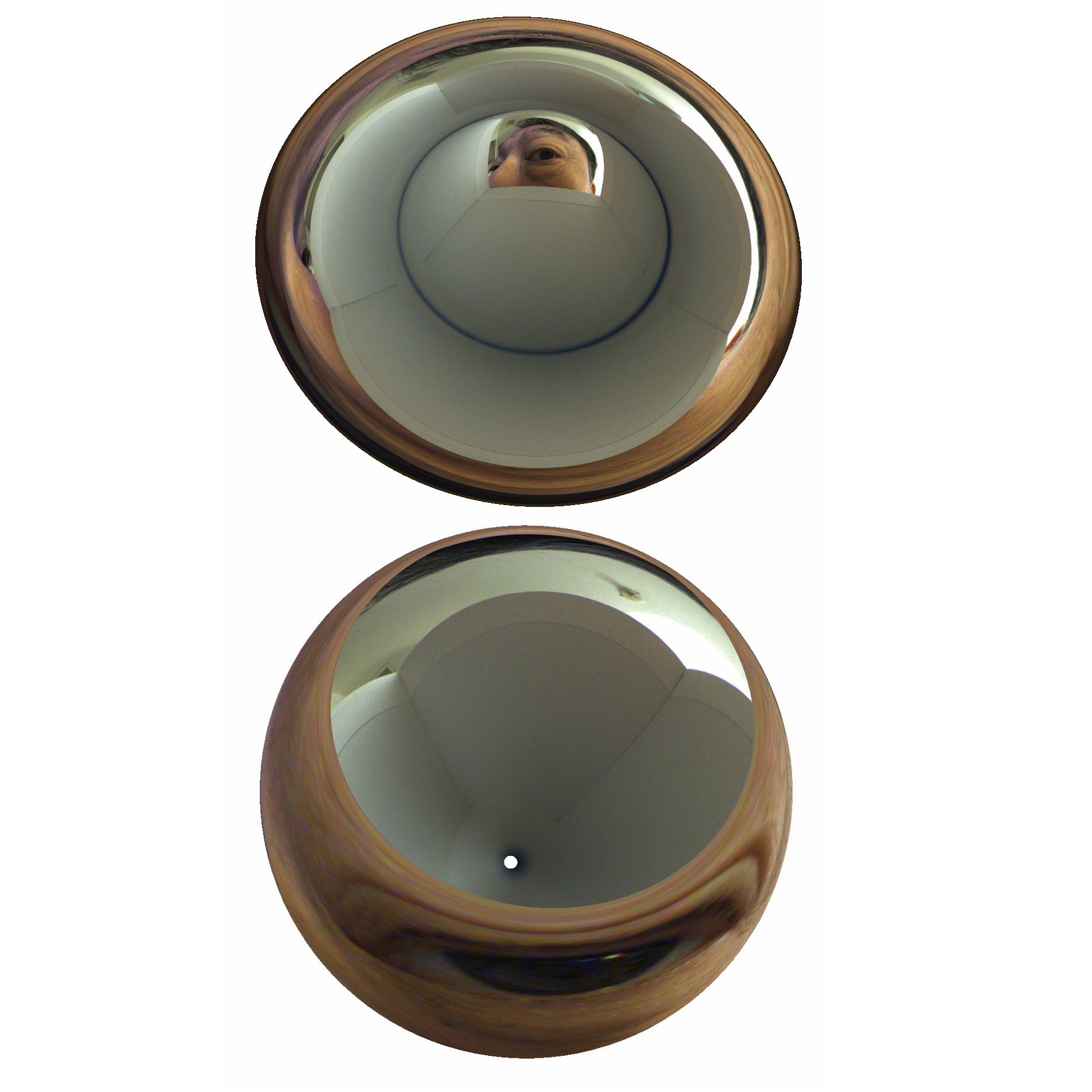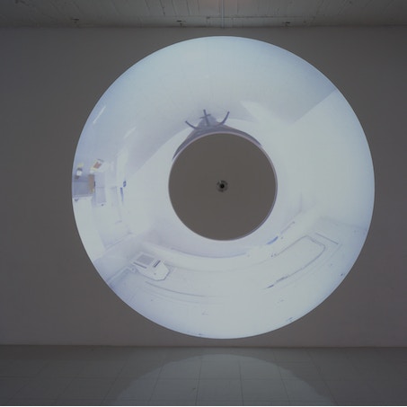 藤幡正樹の個展「E.Q.」は、ふたつの作品(*2)で構成された展示だ。ひとつは《Eternity of Visions(Edition 3 + AP)》(2019)で、180°の天球をとらえるカメラの映像が環状になった帯のかたちで壁に映し出される映像作品。もうひとつは《Matrix of Visions》(2019)で、枕のかたちをした白い石膏に三角形のピースが埋め尽くすようにプロジェクションされているものだ。プロジェクションされる映像は、枕のそばに据え付けられたカメラの映像であり、中の三角形のピースは、それぞれ角度は違えているが、そのすべてが同じ映像を映し出しており、三角形の内部の映像はデジタルズームによって拡大したり縮小したりしている。カメラやプロジェクター、そして映像の変形という操作をはさんでいるが、これらの作品の本質は、いっぽうでは「歪んだ鏡」であり、もういっぽうでは「万華鏡」である。そしてそれ以上のものではない。