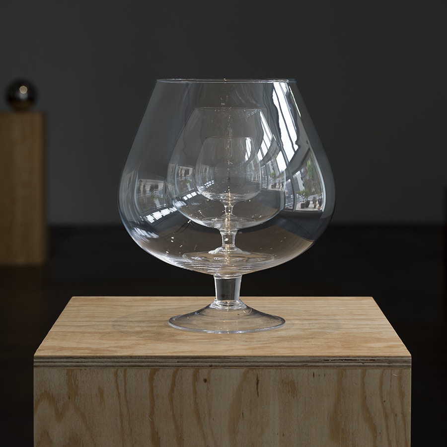 「これはその空間自体を空間の中に反復する試みである」。それはギャラリーに置かれた5点のオブジェクトによって実現されている。L字型をしたギャラリーの中央付近には、周囲の風景を反射する鏡面の球体が配置されている。カウンターテーブルは「75%、50%、25%とそれぞれ縮小」され、3つの複製がそれぞれ空間の隅に置かれている。木製の台の上に載った3つのコニャック・グラスは縦に重なり、カウンターテーブルを含む周囲の風景や互いの反射を映している。