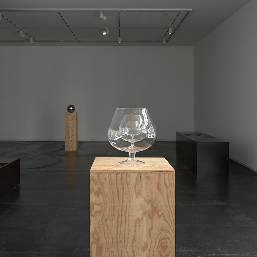 そのときあなたは、この展覧会が鑑賞者がいなくとも成立することに気づくかもしれない。金属の球体は眼球=レンズの代替物としてここに置かれ、そしてコニャック・グラスもまた、縮尺の変わる3つのオブジェクトに対応する、3重の眼球=レンズとしてここにある。展示室は鑑賞者ではなく、この2点を中心につくられている。それに気づいたとき、あなたは構築された奥行きに「より一層入り難く」感じ、「reception=歓迎、受け入れ」という皮肉を理解するだろう。あなたが踏み入れたのは、観測者なき思索の世界なのだ。