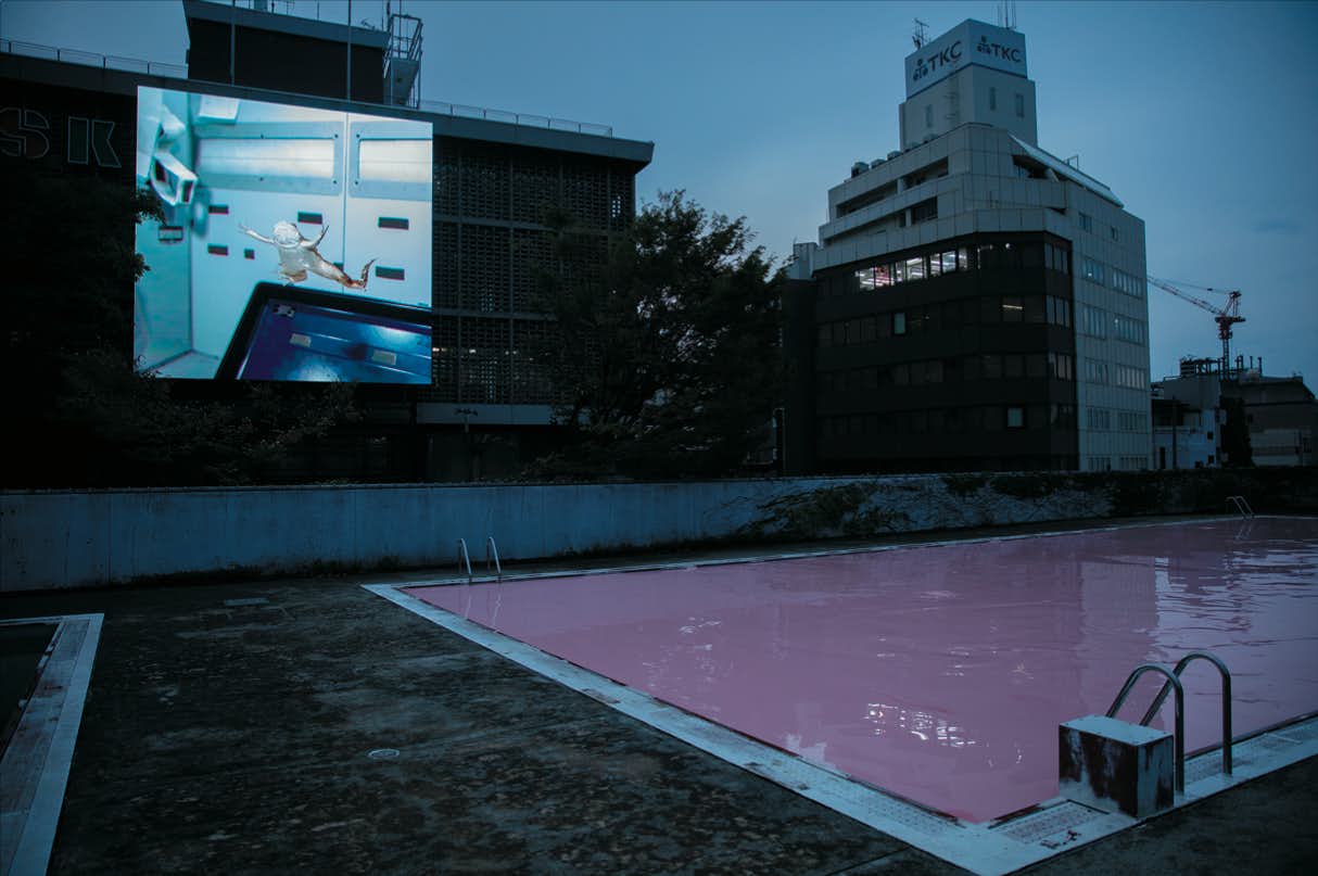 「岡山芸術交流2019」より、写真上がジョン・ジェラード《アフリカツメガエル(宇宙実験室)》(2017)、手前がパメラ・ローゼンクランツ《皮膜のプール(オロモム)》(2019) Photo by Ola Rindal Courtesy of the artist, Thomas Dane Gallery and Simon Preston Gallery Courtesy of the artist, Karma International, Miguel Abreu Gallery and Sprüth Magers