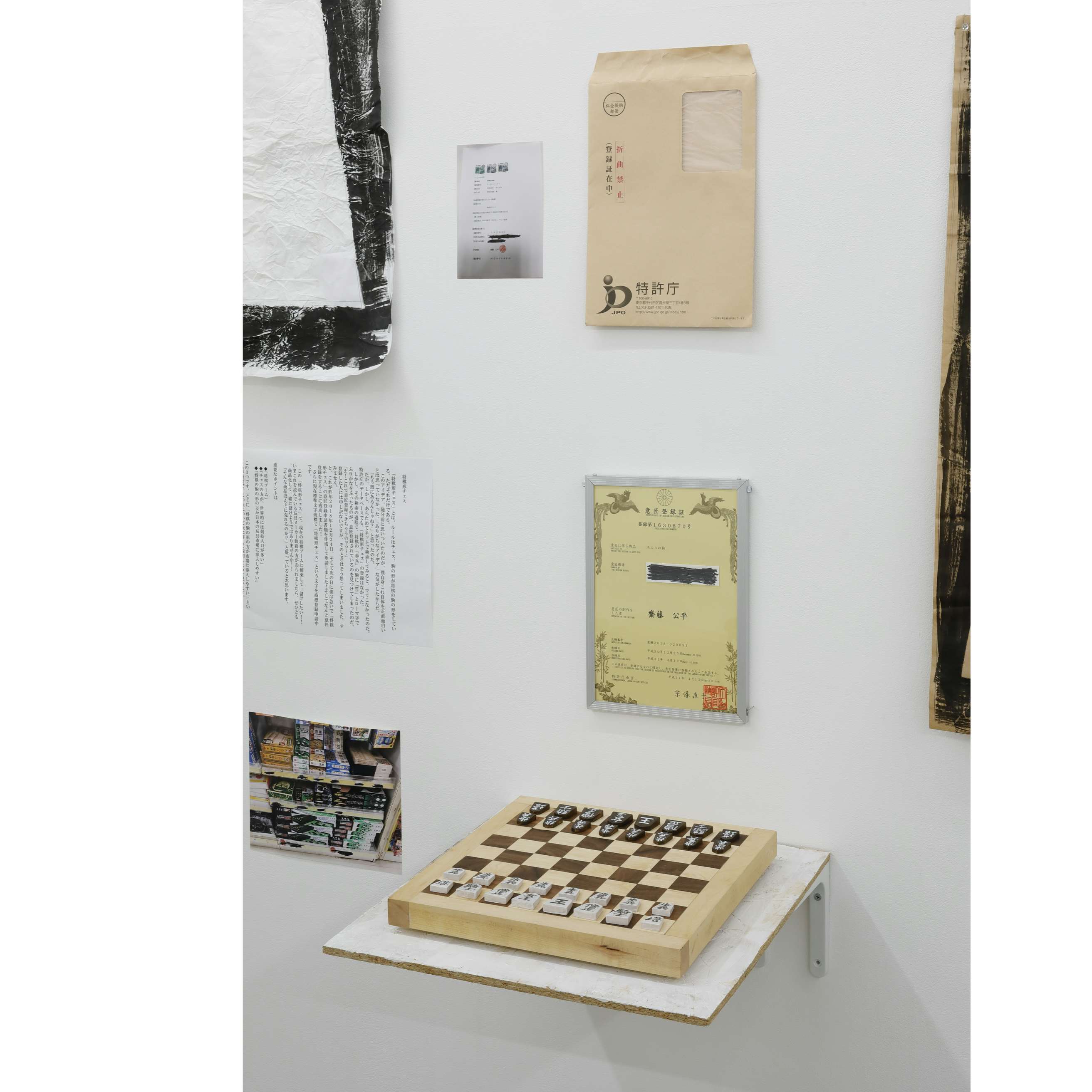 古代インドのボードゲーム「チャトランガ」をルーツにもつとされる「二人零和有限確定完全情報ゲーム」を代表する「チェス」と「将棋」であるが、前者においては垂直的、後者においては水平的、というように駒の形状を異にしている。こうした立体的なチェスの駒と平面的な将棋の駒に、ヨーロッパと日本の伝統的な絵画空間における、三次元性と二次元性を透かし見ることもできよう。斉と公平太は「将棋形チェス」として、文字通り、将棋盤の9×9のマスをチェス盤の8×8のマスへ、そして8種の将棋の駒を6種のチェスの駒へと物理的に置換する。将棋形チェスの試作品では、市松模様のチェス盤に、白と黒の将棋の駒が置かれ、それぞれに漢字でチェス駒の名(王、女王、塔、僧正、騎士、歩兵)が書かれており、またプレゼン用デモ機では、将棋盤が8×8のマスとなるように切断されているが、駒は白と黒には分かれておらず、将棋駒に片仮名でチェス駒の名(キング、クイーン、ルーク、ビショップ、ナイト、ポーン)が書かれている。