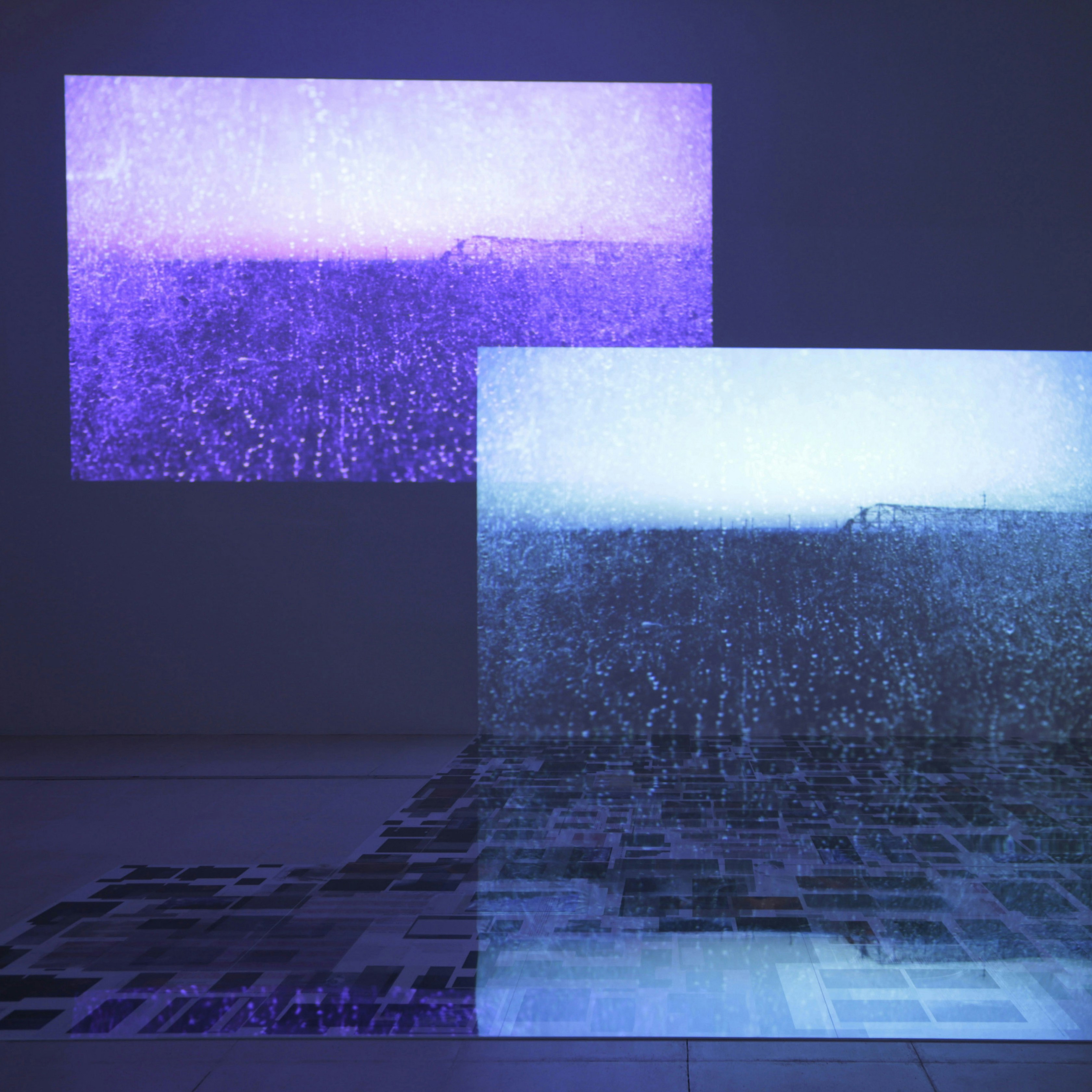 次の根間は薄暗いフロアに「Paradigm」と「Simulacre」のシリーズが展示されていた。多くの場合、根間が撮る沖縄の風景はブレやボケで明瞭さに欠け、写された土地とのつながりはわずかだ。「Paradigm」は薄暗い壁面に見上げるような高さまでランダムに配置されたことでイメージの抽象度がさらに増し、「Simulacre」は作品が鑑賞者に明確な印象を与えることを拒むかのように、印刷の刷版やプロジェクションなど複数の媒体からなるひとつの大きなインスタレーションとして展示されていた。「Simulacre」のプロジェクションの反射で展示室の雰囲気もわずかに変わる。写真でありながらひとつのイメージとして定着されることを避けるような仕掛けが展示室全体に施されていた。