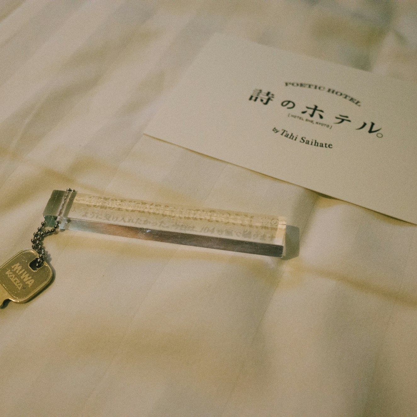 *1──ホテル内の全3室(ツインルーム2部屋 / ダブルルーム1部屋)で、すべての部屋ではない。筆者が宿泊したのはツインルームの104号室である。ルームキーには、「この町の全てがぼくのものではないということを、植物のように受け入れたかった。今日は、104号室で眠ります。」とある。
