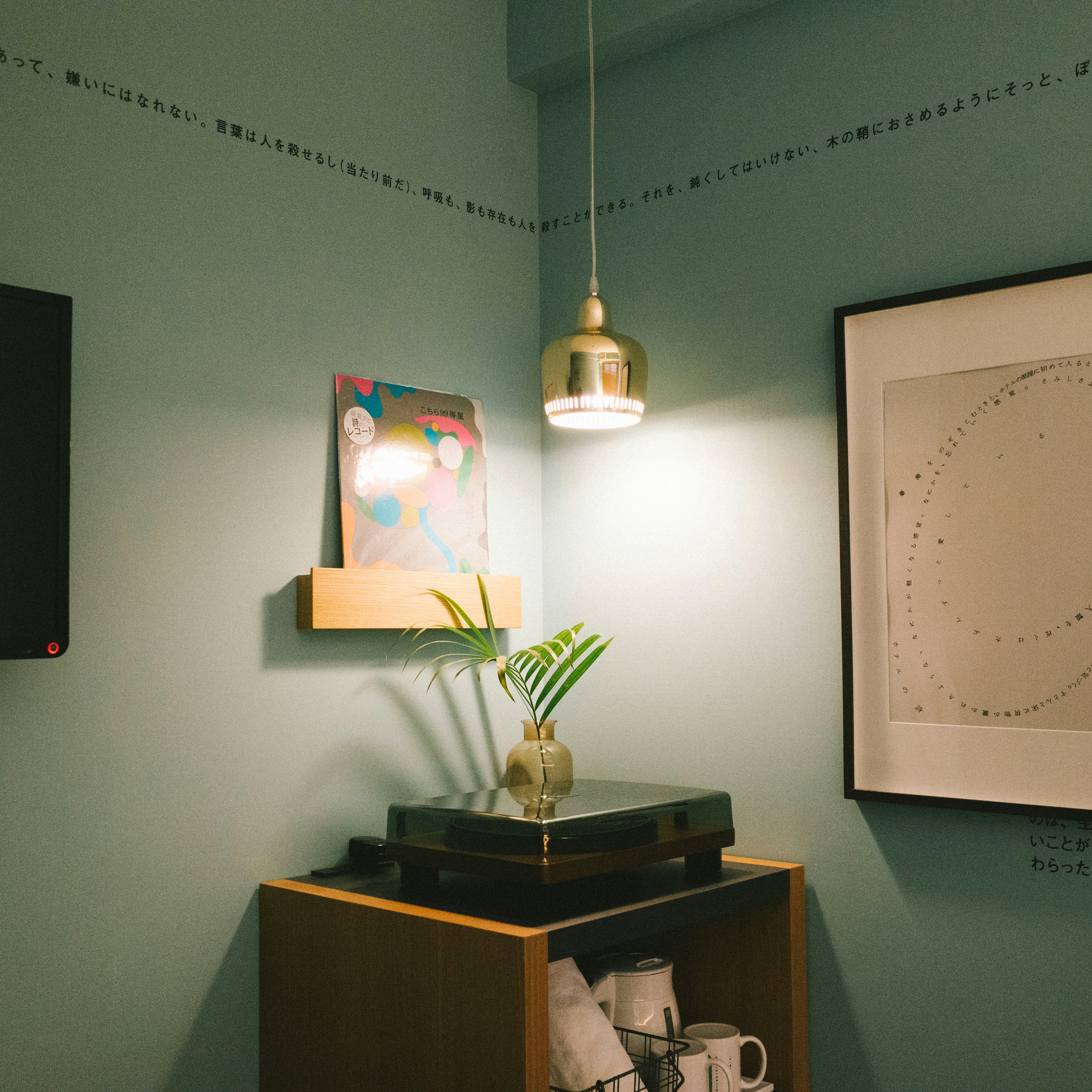 ルームキー。客室のドア。室内の壁。レコードプレーヤー。マグカップ。寝具。クッション。エアコン。姿見。浴室のドア。浴室の壁。シャンプー。トリートメント。ボディーソープ。