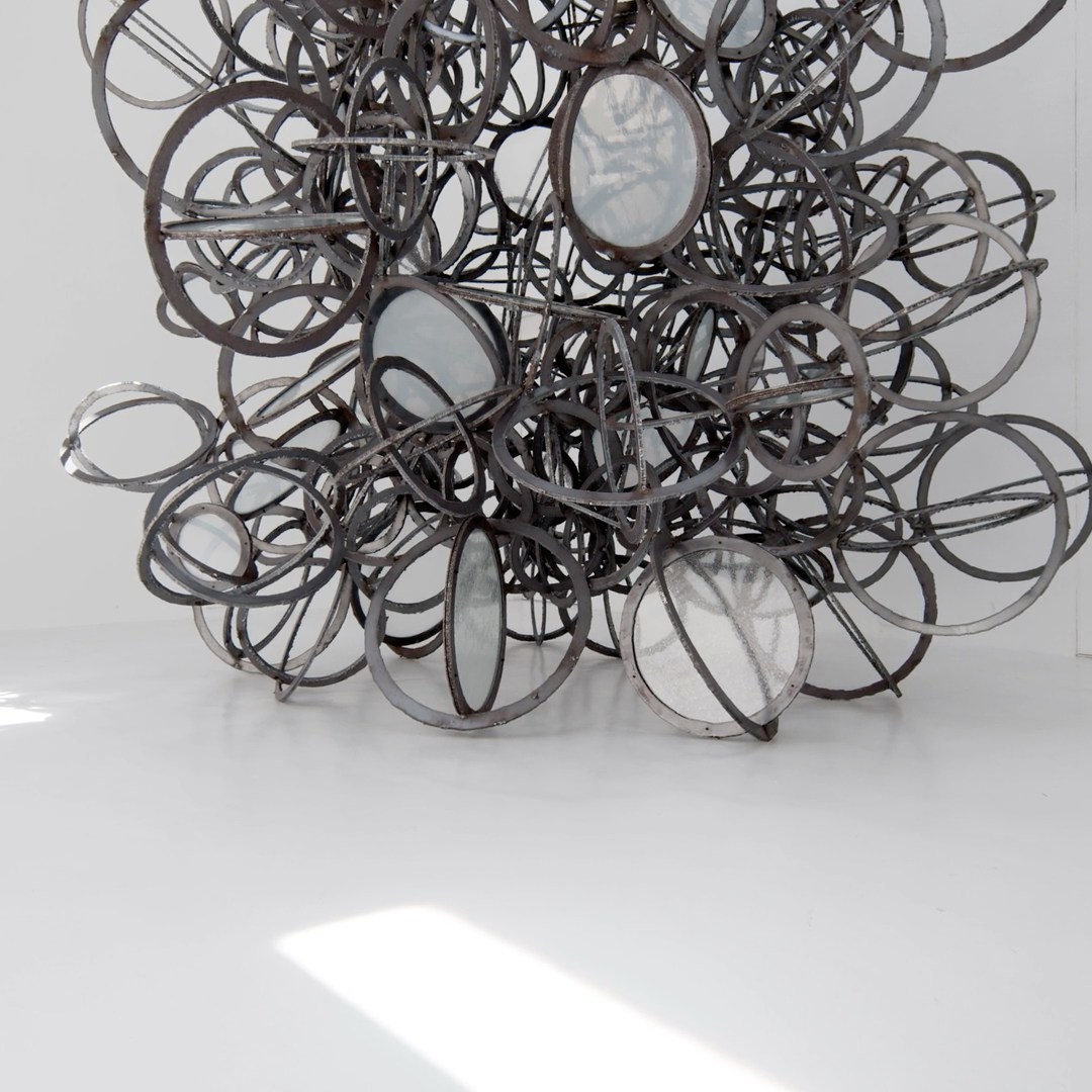 ウェブサイトでは、視聴者が自由に視角や進行方向を操作できる360度カメラのヴァーチャルツアーが1本、Vimeoと連携した展示風景の映像記録が2本、計3本の動画が公開されている。三種三様の興味深いアプローチが確認できるが、ここではメインの展示室に設置された青木の彫刻作品《微塵》(2020)を撮影した2本目の動画を主に取り上げよう。4分14秒という決して長くはない尺のなかで、カメラは鉄のリングの集合体による彫刻作品《微塵》への接近と離反を行い、人間の眼では不可能な空間認識を観賞者(視聴者)に提供する。
