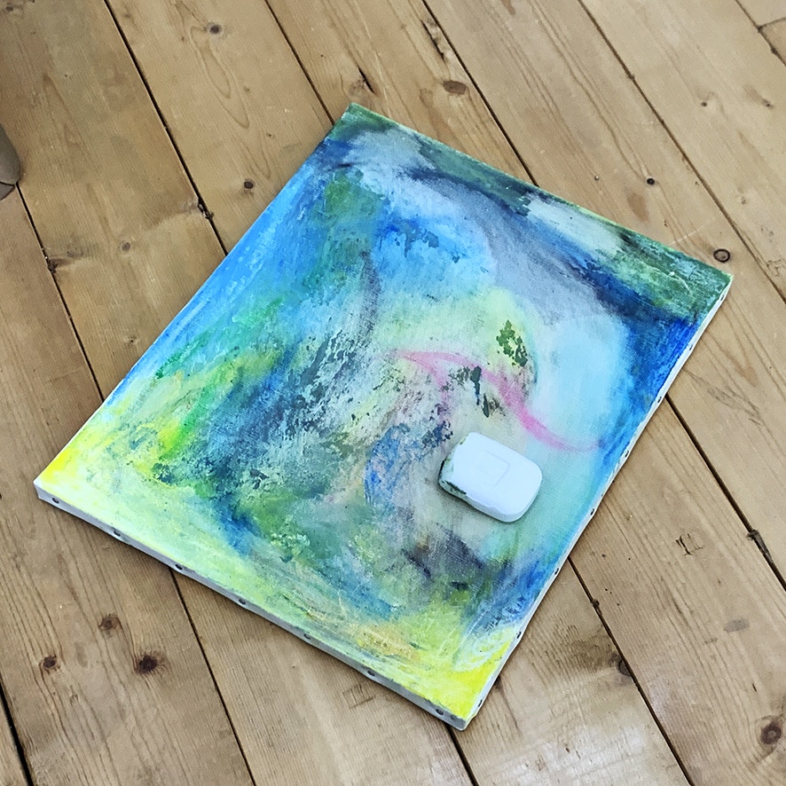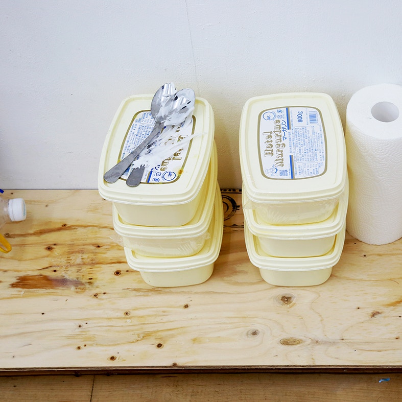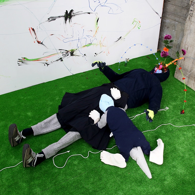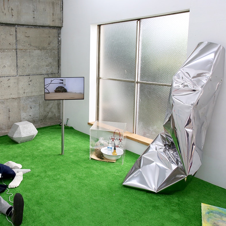 まず、そこで起こっている状況をざっくりと説明する。L字型の部屋、入って右手に透明樹脂でつくられた山のかたちのようなオブジェ、壁面には作者が窓に息を吹きかけ掃除をするループの映像、部屋の角に大量のマーガリン。その奥には冒頭で述べたような、寝そべり手を伸ばすだけでなんとか生活が行えるようなマットレスと生活雑貨。壁にはドローイングがかけられている。マットレスの上には、およそ成人男性ぐらいあるであろう人形がいる。L字型の部屋を曲がると人工芝が敷かれており、亀の映像と子どもとそれよりやや大きいくらいのサイズの人形がいる。壁にはまたドローイングがかけられている。