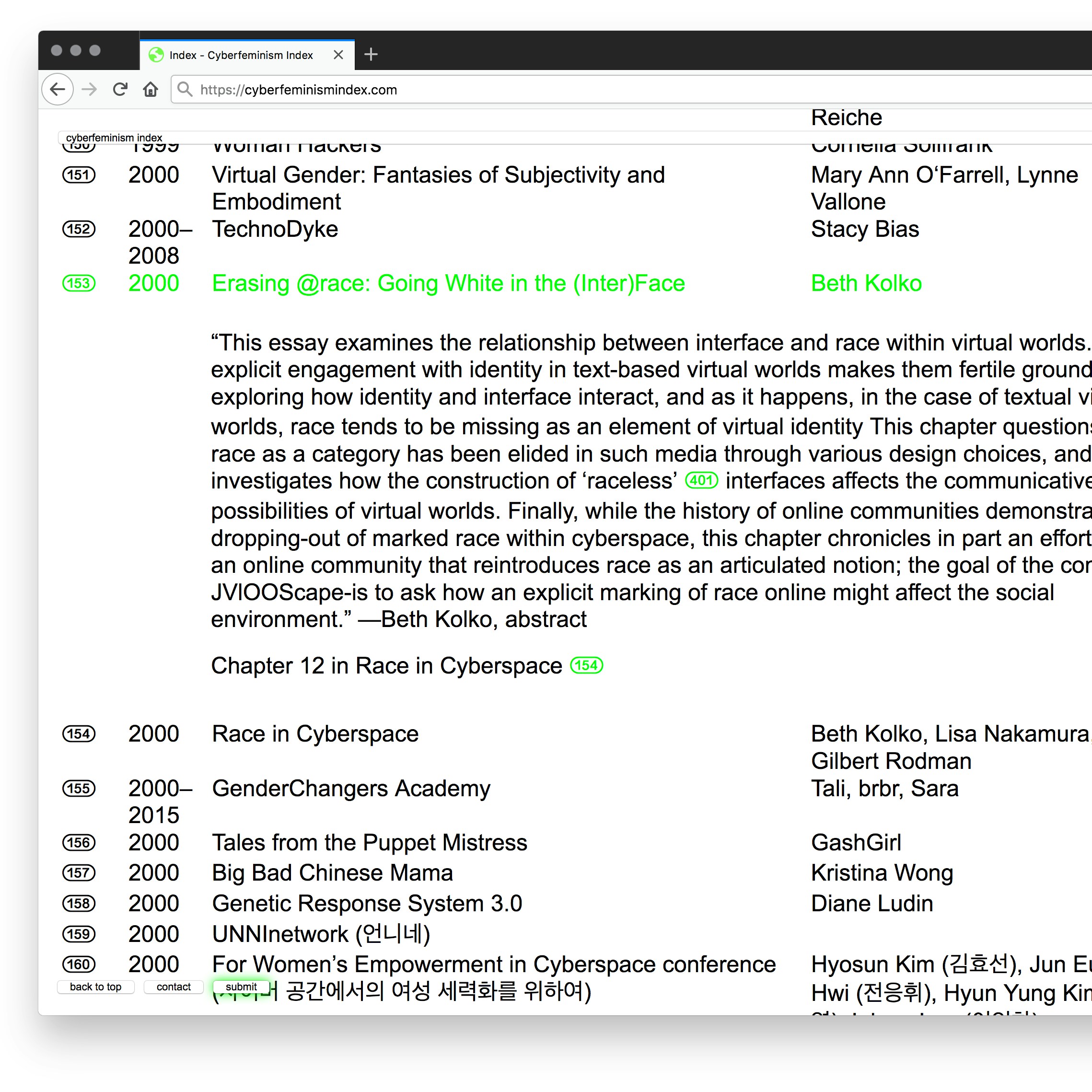 Marie Hoejlund ”Sharing as Survival: Mindy Seu on the Cyberfeminism Index” Walker, Nov 9, 2020 (https://walkerart.org/magazine/sharing-as-survival-mindy-seu-cyberfeminism-index)、2021年3月3日閲覧。