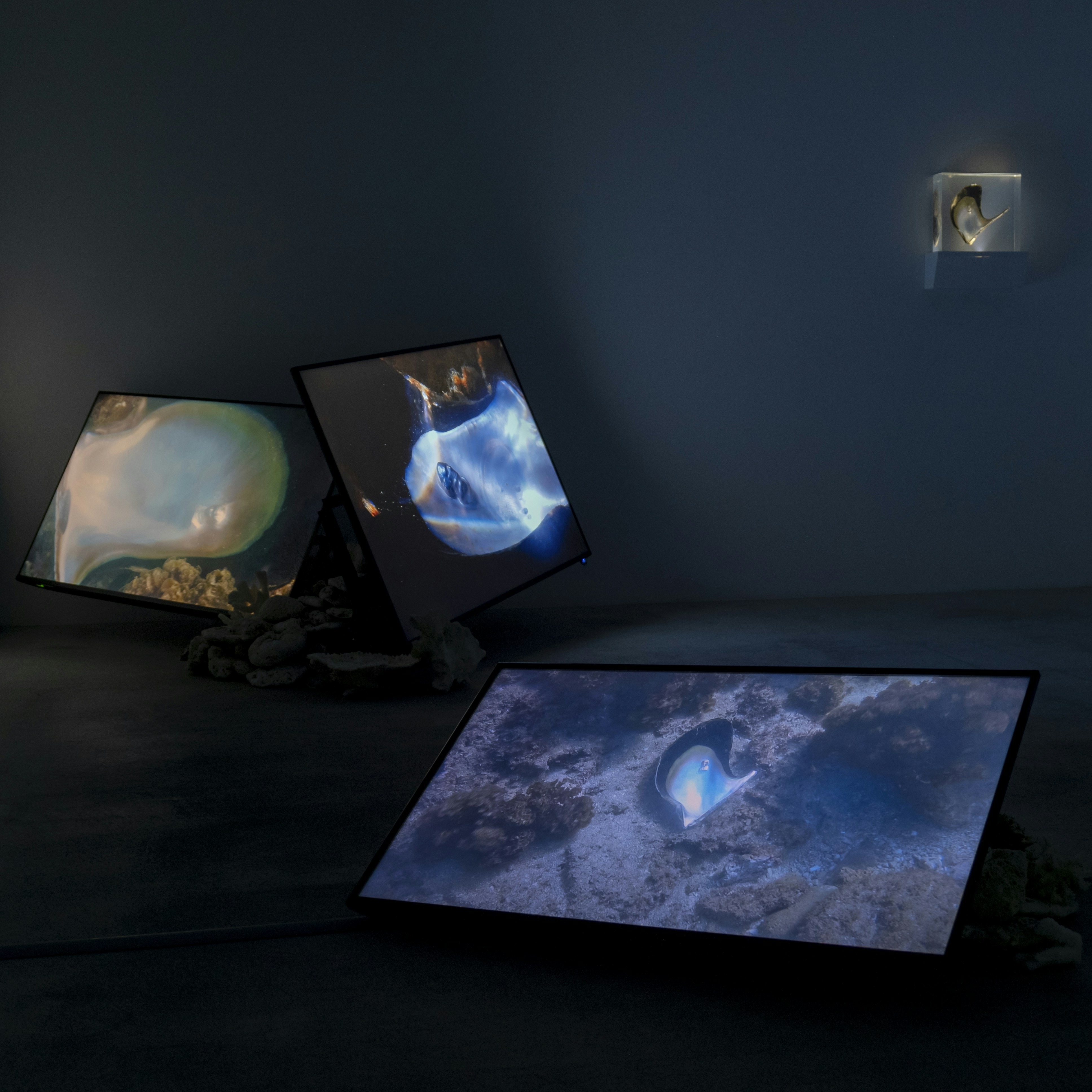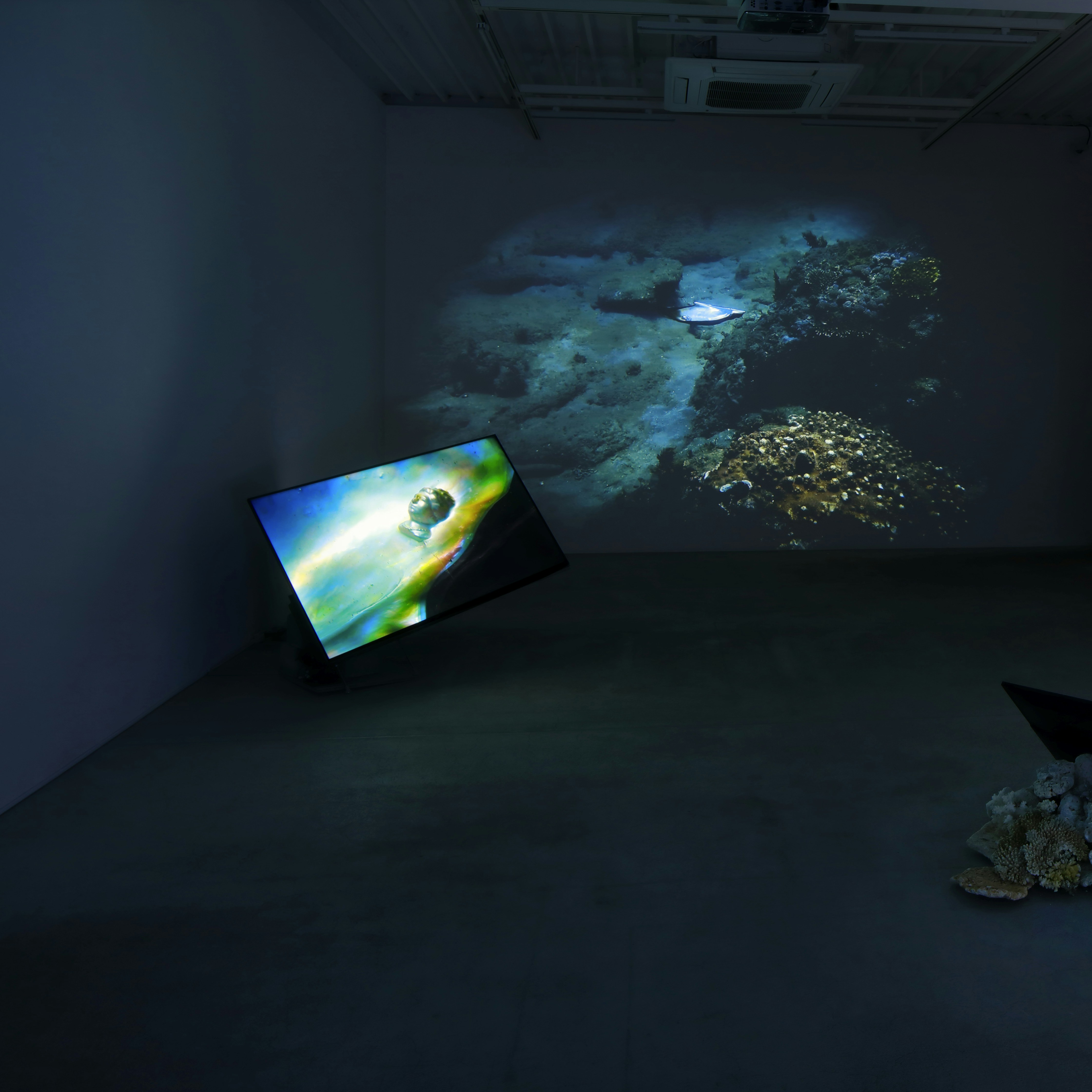 いっぽうでこのような点は、人新世に関わる美術(視覚)表現の傾向のひとつとして分類することも可能である。大森俊克は、この傾向は3つに分類されるとし、そのうちの1つとして、思弁的実在論などの哲学的潮流を背景とした人類滅亡後の世界を扱う表現や、「地層」への介入を視座とする作品を挙げている(*5)。本展もまたこうしたグローバルアートのトレンドとして端的に分類することも可能である。とりわけ、真珠貝の作品そのものよりも、それを海へと沈めるマルチチャンネルの映像による物語を中心に構成されている点により、本展はこうした言説のなかで安易に還元されてしまう可能性がある。例えば、制作物を海に沈め、後の時代に発見されるという物語は、ダミアン・ハーストが2017年にヴェネチアで行った個展「Treasures from the Wreck of the Unbelievable (難破船アンビリバボー号からの財宝)」(*6)によって、圧倒的な予算規模とスケールで、作家の生み出した虚構の一大叙事詩として、グローバルアートワールドのなかで決定的に提示されている。